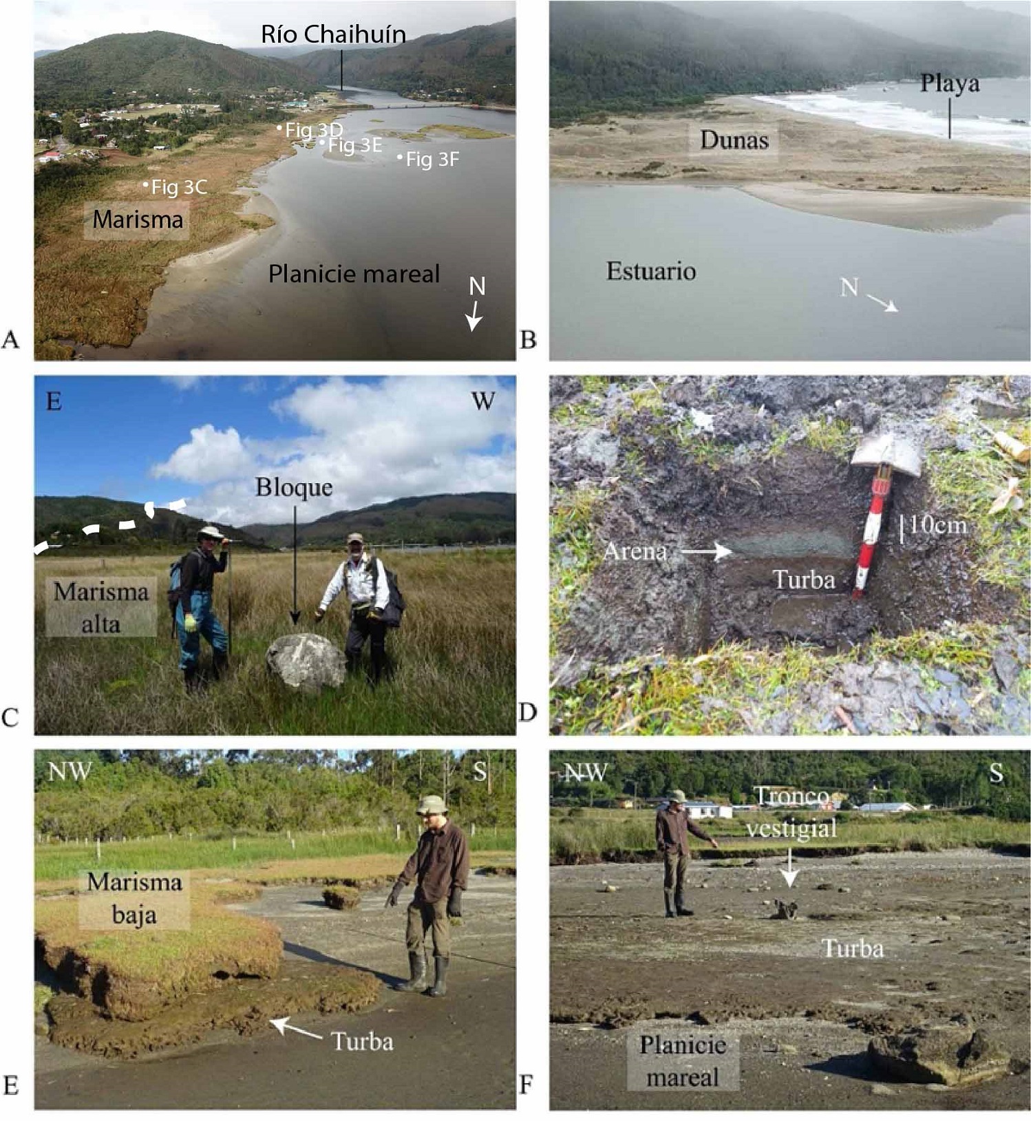 Fig. 3. A-B. Fotografías oblicuas de los ambientes modernos tomadas con un dron. En 3A se señala la ubicación de las fotografías 3C a 3F. C. Bloque posiblemente transportado por un tsunami. D. Evidencia del tsunami de 1960 (arena descrita por Hocking et al., 2017). E. Turba correspondiente a la planicie mareal pre-1960 sepultada por depósitos estuariales actuales. F. Restos de tronco vestigial sobre dicho nivel de turba. Evidencia del aumento del nivel relativo del mar por subsidencia costera.