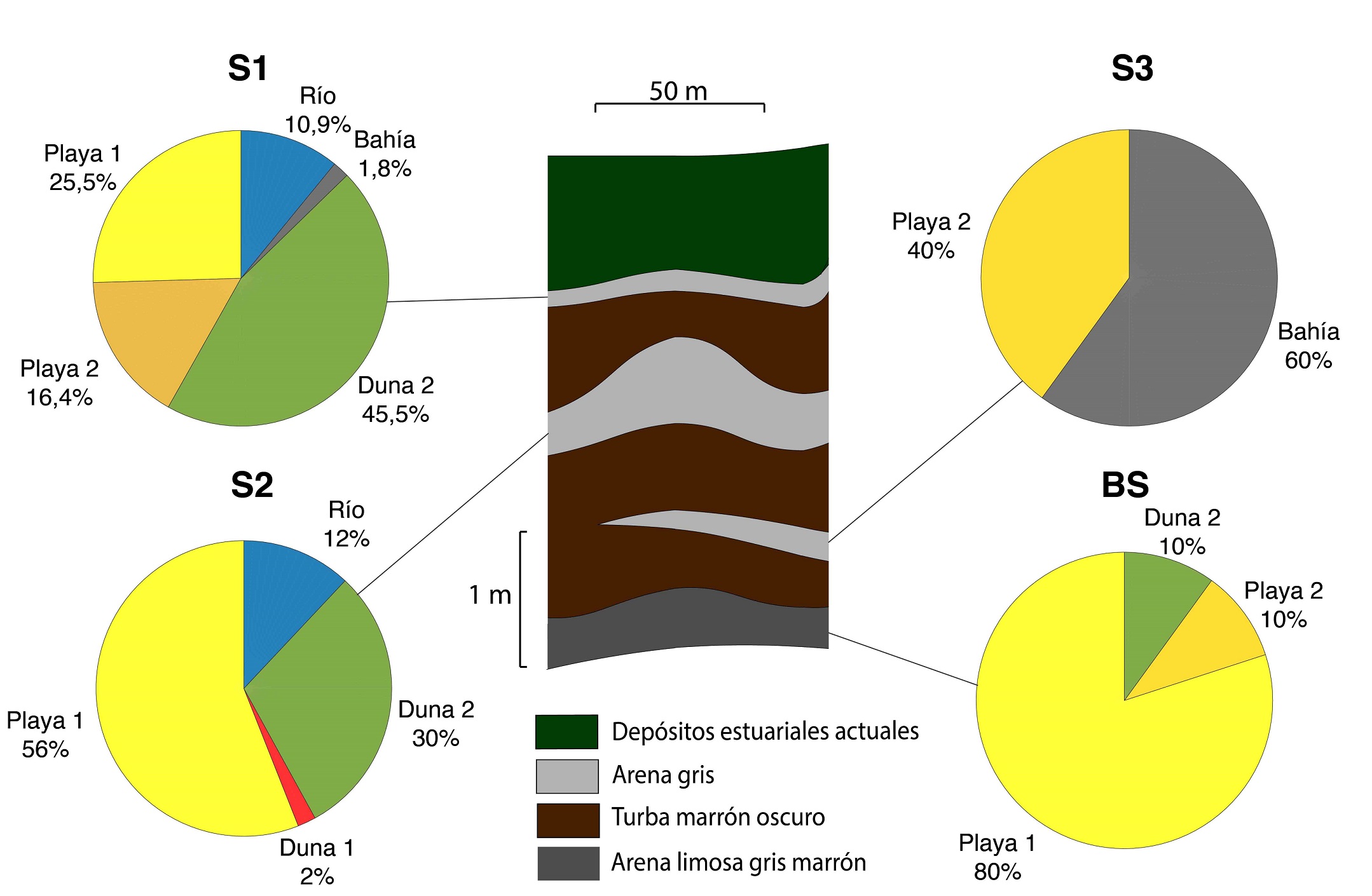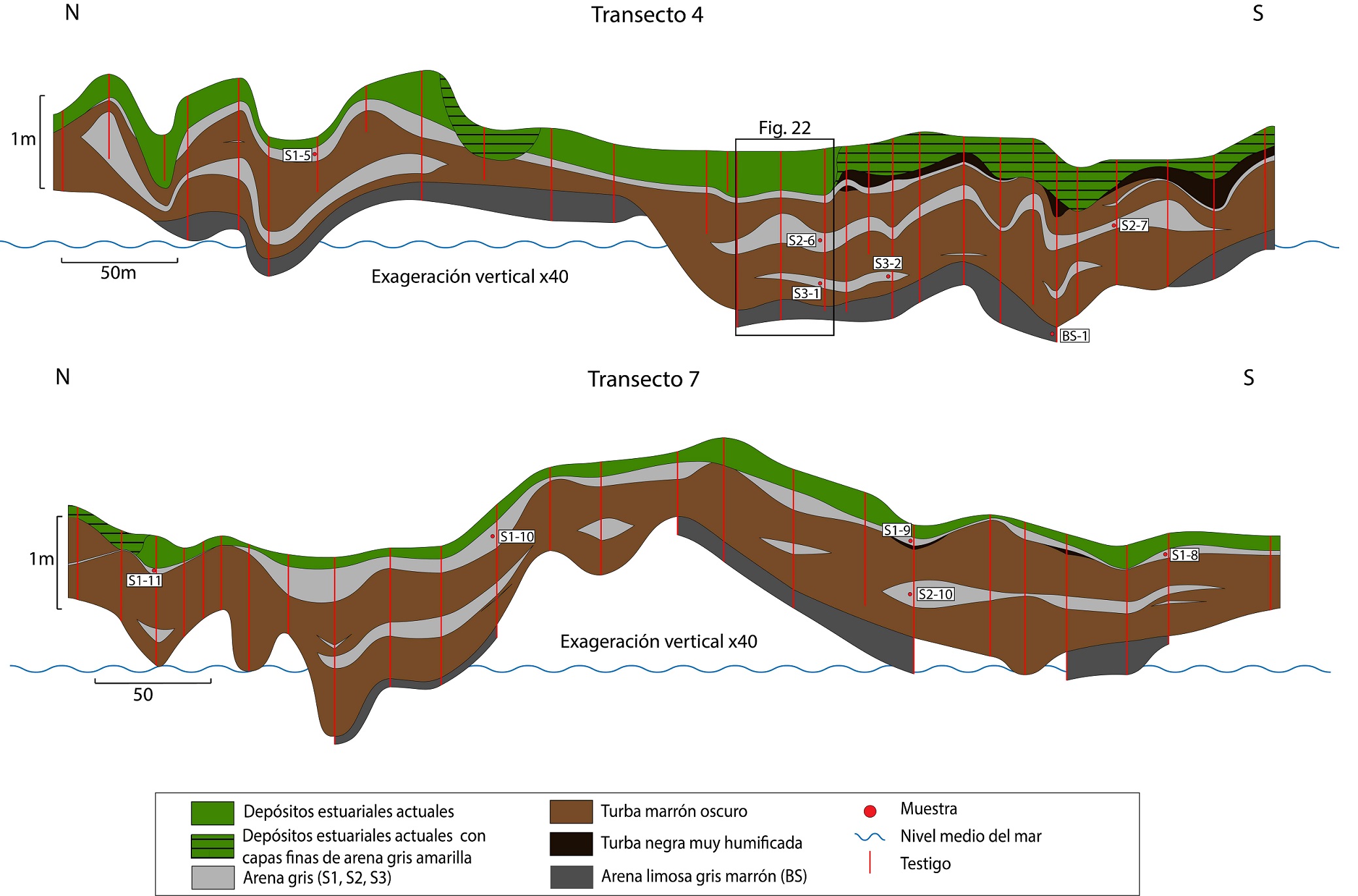 Con la información recogida en los testigos se elaboraron 7 secciones, en donde las diferentes capas se relacionaron entre sí, con base en sus características sedimentológicas, altura y espesor, para establecer su continuidad y distribución dentro de la marisma. De esta manera se definieron 4 capas de arena: S1, S2, S3 y BS (de más reciente a más antigua), que presentan continuidad dentro de la superficie estudiada.