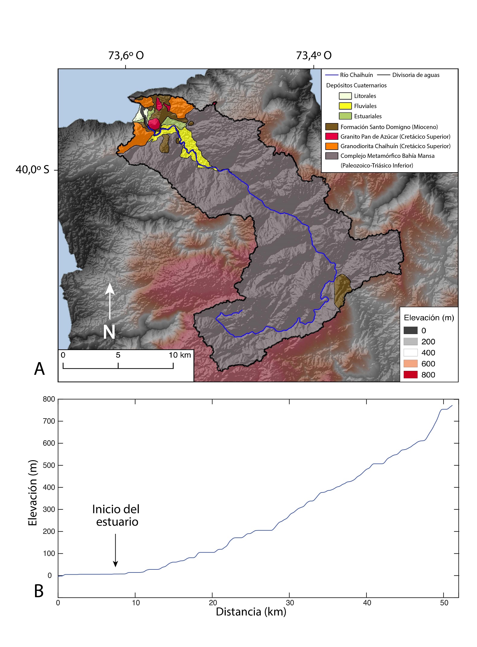 A1. A. Mapa geológico de la cuenca del Río Chaihuín. B. Perfil longitudinal del río.
