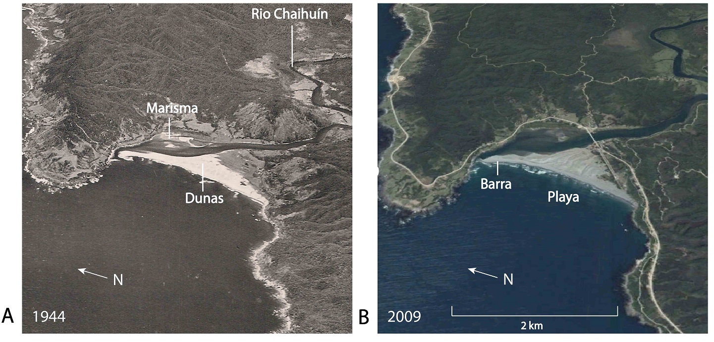 Utilizando imágenes aéreas se mapearon los ambientes modernos que son relevantes para este estudio dentro de la localidad de Chaihuín: el estuario, el río, la marisma (alta y baja), las dunas, la playa y la barra (Fig. 3A y B). Adicionalmente, al comparar imágenes anteriores y posteriores al terremoto de 1960, se observó que luego de este se originó un cambio en el nivel relativo del mar, reflejado en la inundación del área correspondiente a la marisma (Apéndice A2).