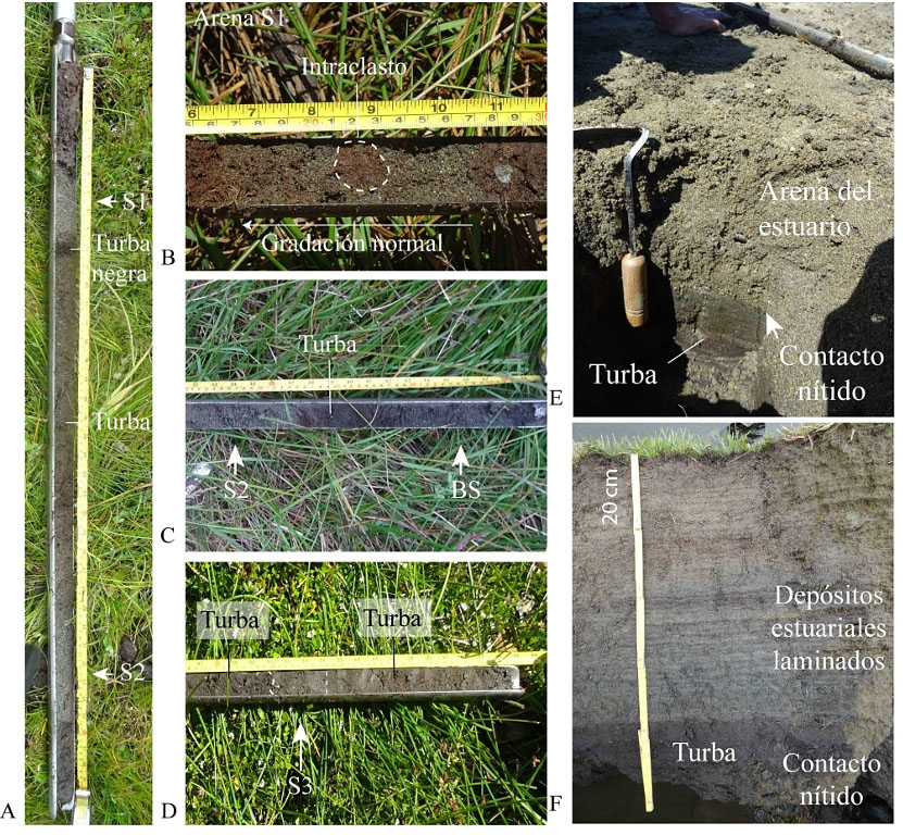 Adicionalmente, se describieron 2 capas de turba negra muy humificada, una que sobreyace a S1 y otra que la subyace. En ambos casos los contactos de esta capa son nítidos y el espesor de ambas varía entre 1 y 15 cm (Fig. 4). Además, se describió un nivel de turba marrón oscuro que subyace a la arena depositada actualmente por el estuario (arena media con coloración marrón a amarillo) y al suelo moderno, destacándose este último en las zonas más bajas por presentar múltiples capas planas de arena fina/media intercaladas (Apéndice A3). Este tipo de turba es la que separa a todas las capas de arena.
