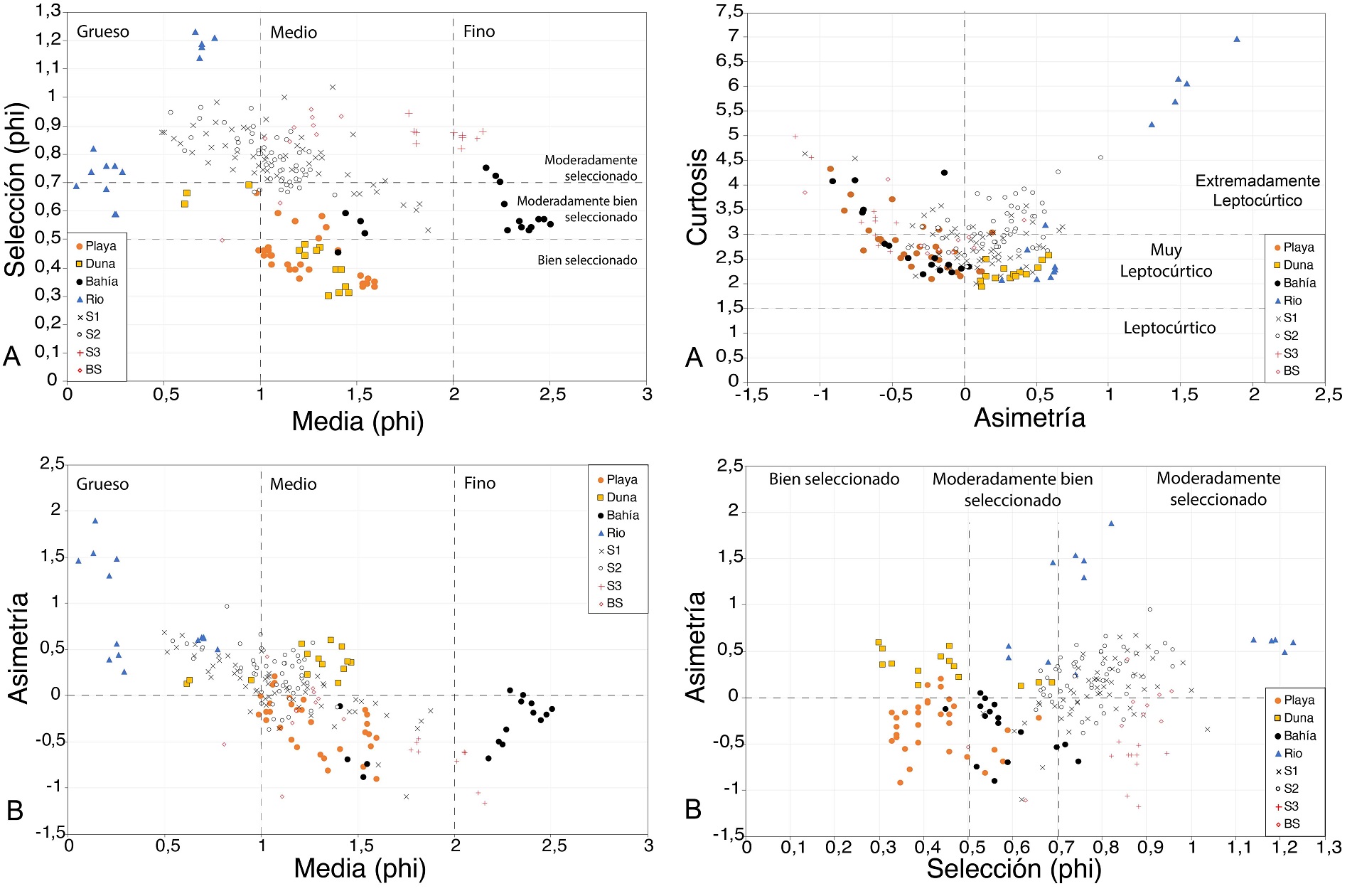 En cuanto a la selección se aprecia que tanto las muestras de playa como las de dunas tienen una buena selección (<0,5 phi), las de bahía presentan valores ligeramente menores (0,5-0,7 phi), mientras que las demás se distribuyen mayoritariamente en un rango de selección moderada (0,7-1 phi). Por otra parte, las muestras de playa, bahía, S3 y BS son negativamente asimétricas, en tanto que las de dunas, río, S1 y S2 presentan asimetría positiva. Finalmente se observa que las muestras se distribuyen desde muy leptocúrticas a extremadamente leptocúrticas. Cabe señalar que las muestras de río presentan una dispersión notoria, sobre todo en los parámetros de selección y curtosis.