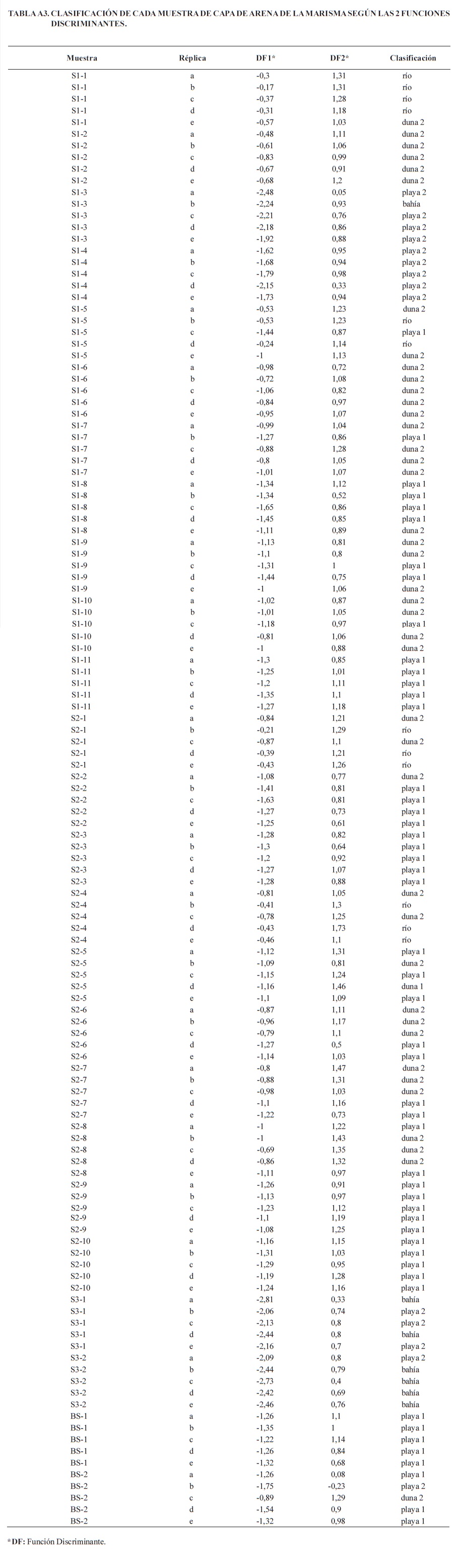Tal como se evidencia en el análisis factorial, las muestras de los distintos tipos de ambientes presentan una diferenciación clara, sobre todo en la media, la asimetría y la selección en menor grado, de los cuales el grupo formado entre muestras de playa y duna es el más mezclado y disperso. De esta forma es posible realizar una distinción entre 2 poblaciones distintas de cada uno de dichos grupos (separados como playa 1, playa 2, duna 1 y duna 2). El análisis discriminante, con base en los parámetros granulométricos, calcula 2 funciones capaces de explicar la variabilidad de los datos originales (Tabla 1). Estas son capaces de clasificar el 100% de las muestras de ambientes modernos en uno de los 6 grupos resultantes de manera estadísticamente significativa (Tabla 1: bahía, río, playa 1, playa 2, duna 1 y duna 2). Al ingresar los datos de las distintas capas de arena al modelo discriminante así generado se puede observar que S1, S2 y BS son clasificadas como playa o duna, y S3 se divide entre bahía y playa (Fig. 7; información detallada de las muestras en Apéndice A6 y Tabla A3).