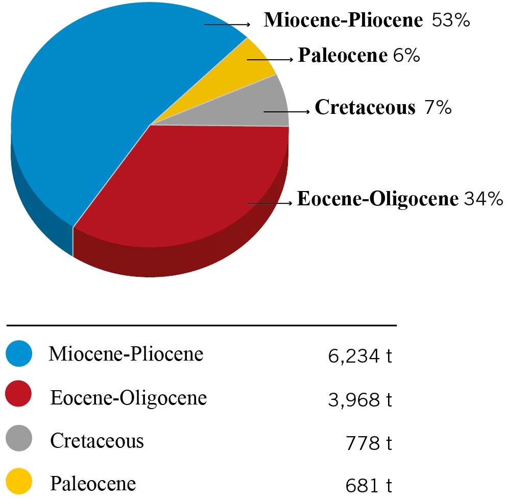 Fig. 2. Gold content (%) in different geological epochs and periods based on 31 main gold deposits (Table 1). Cretaceous 238 t (6 deposits), Paleocene 339 t (4 deposits), Eocene-Oligocene 126 t (2 deposits), Miocene 4,524 t (19 deposits).