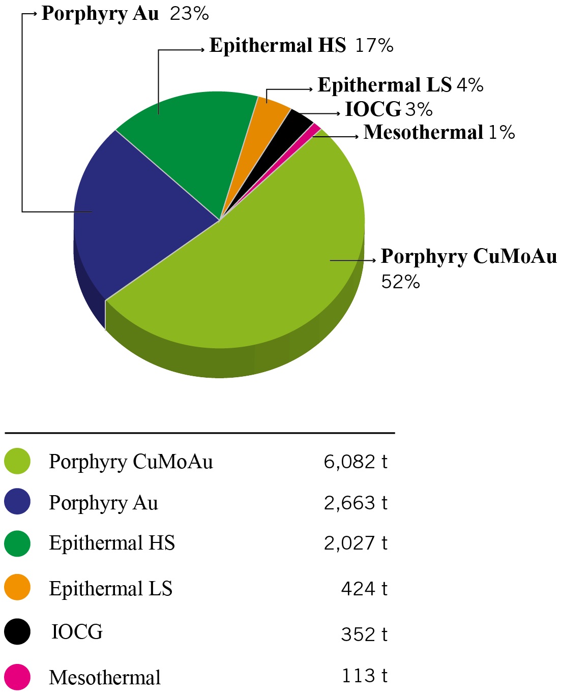 Fig. 7. Gold content (%) in different deposits type based on 31 main gold deposits (Table 1), 16 IOCG deposits (Table 2) and 35 porphyry Cu-Mo-Au deposits (Table 3). Mesothermal 113 t (2 deposits), Epithermal LS 424 t (7 deposits), Epithermal HS 2,027 t (15 deposits), Porphyry Au 2,663 t (7 deposits), IOCG 352 t (16 deposits), Porphyry Cu-Mo-Au 6,082 t (35 deposits).