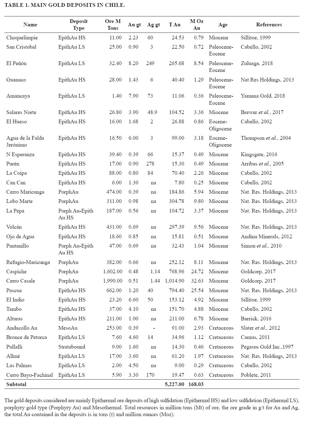 Volcanic rocks of Upper Oligocene-Late Miocene age host some of the larger gold deposits. Volcanism of this period, was formed during a time of faster and less oblique plate convergence (Pilger, 1984). A shallowing subduction zone generated a greater width of the related volcanic arc, as well as of the associated mineralization (Sillitoe, 1992). Two types of gold deposits are in this magmatic belt: high sulfidation epithermal deposits in the so-called Maricunga and El Indio belts and porphyry gold deposits also occurring in the Maricunga region (Vila and Sillitoe, 1991). These gold deposits formed from 10 to 6.2 Ma (Bissig et al., 2001; Sillitoe, 2008), after andesitic volcanism in the region had ceased (Kay et al., 1999) and the magmatic activity had moved to the east (Bissig et al., 2003). Volcanic rocks in both districts overly Upper Paleozoic granitic and felsic volcanic basement with clear evidence of crustal assimilation (Davidson and Mpodozis, 1991). Considering the tonnage and grade information available (Table 1) can be reported a gold content of 3,189 t for the Maricunga belt (14 deposits) and 1,310 t for the El Indio belt (4 deposits).