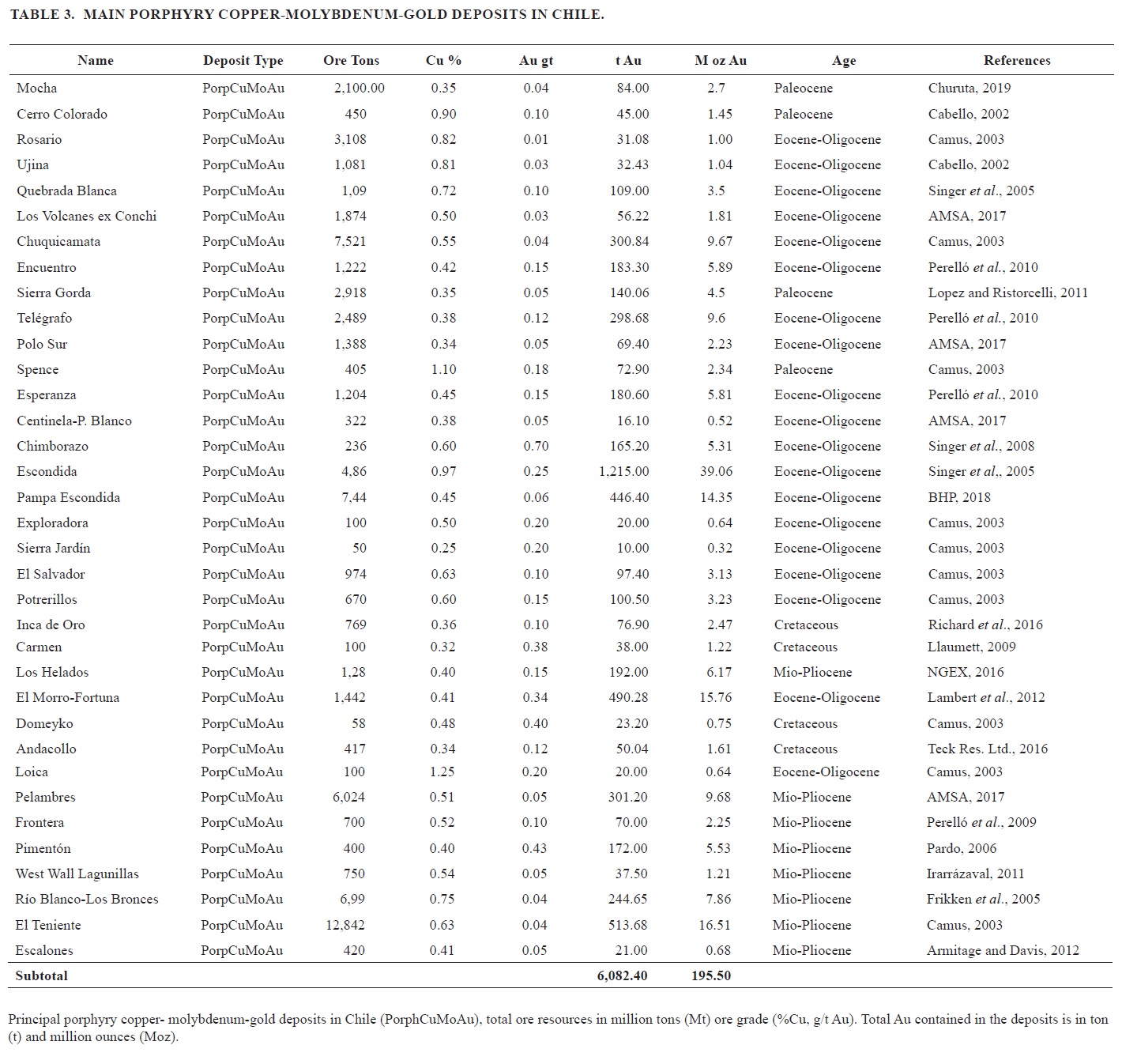 At least some 34 porphyry copper deposits and/or districts of different ages are known to contain gold (Table 3). In spite of their mostly low gold content, due to their sometimes huge reserves, porphyry coppers represent a major source of gold in the Chilean Andes. The gold content of the Chilean porphyries has been only partially documented yet (Perelló and Cabello, 1989) but seems to be enough to realize their importance regarding the content of this precious metal. Previous studies mentioned as deposits with important gold content the cases of Andacollo (Llaumett et al., 1975), Quebrada Blanca (Hunt et al., 1983), El Salvador (Roschmann, 1979) and Potrerillos (Marsh et al., 1997). According to the compilation presented in table 3, publically reported average gold content varies between 0.01 to 0.7 g/t, resulting in 0.15 g/t average content for the 34 cases included. As in the Mesozoic case there are a few mentions of skarn type mineralization related to porphyry copper: they occur in the Centinela District at the Mirador deposit (Apablaza, 2015) as well as in Potrerillos and Escalones, but is not clear yet its influence in gold content for those deposits. Reviewing their gold total content, the first place is for El Teniente (513 t) (Camus, 2003) followed by El Morro-Fortuna District (490 t) (Perelló et al., 1996, Lambert et al., 2012) and Pampa Escondida (446 t) (BHP, 2018), all this cases are obviously influenced by their huge tonnage. The Esperanza and Escondida porphyry copper deposits are mentioned as the current more important gold producer for this ore deposit type. Several other porphyry copper deposit including some recently discovered could have a gold content not known or publically reported yet: Radomiro Tomic, Ministro Hales, Escondida Norte-Zaldívar, Escondida Este, Vizcachitas, San Enrique-Monolito, La Huifa among others. Considering their important mineralized volumes, they could provide significant additional gold resources.