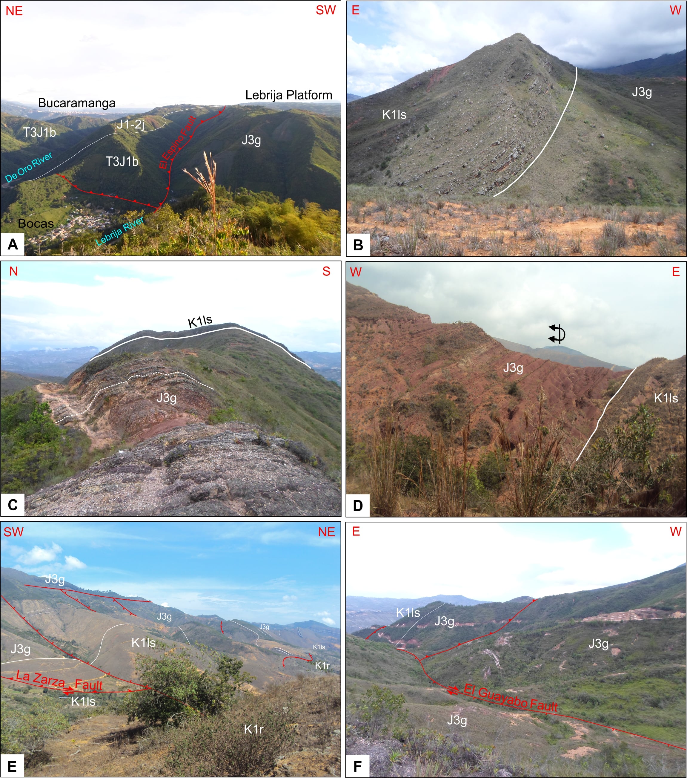 Fig. 4. Field photos of study area. A. the closest area from the Bucaramanga Fault and its splay faults. B. and C. show the transitional contact between the top of the Girón Formation and bottom of the Los Santos Formation. Notice the inverted succession in D., E. and F. show some of the transverse faults that affect the eastern flank of the Cobardes Anticline. Labels as in the geologic map (Fig. 3).