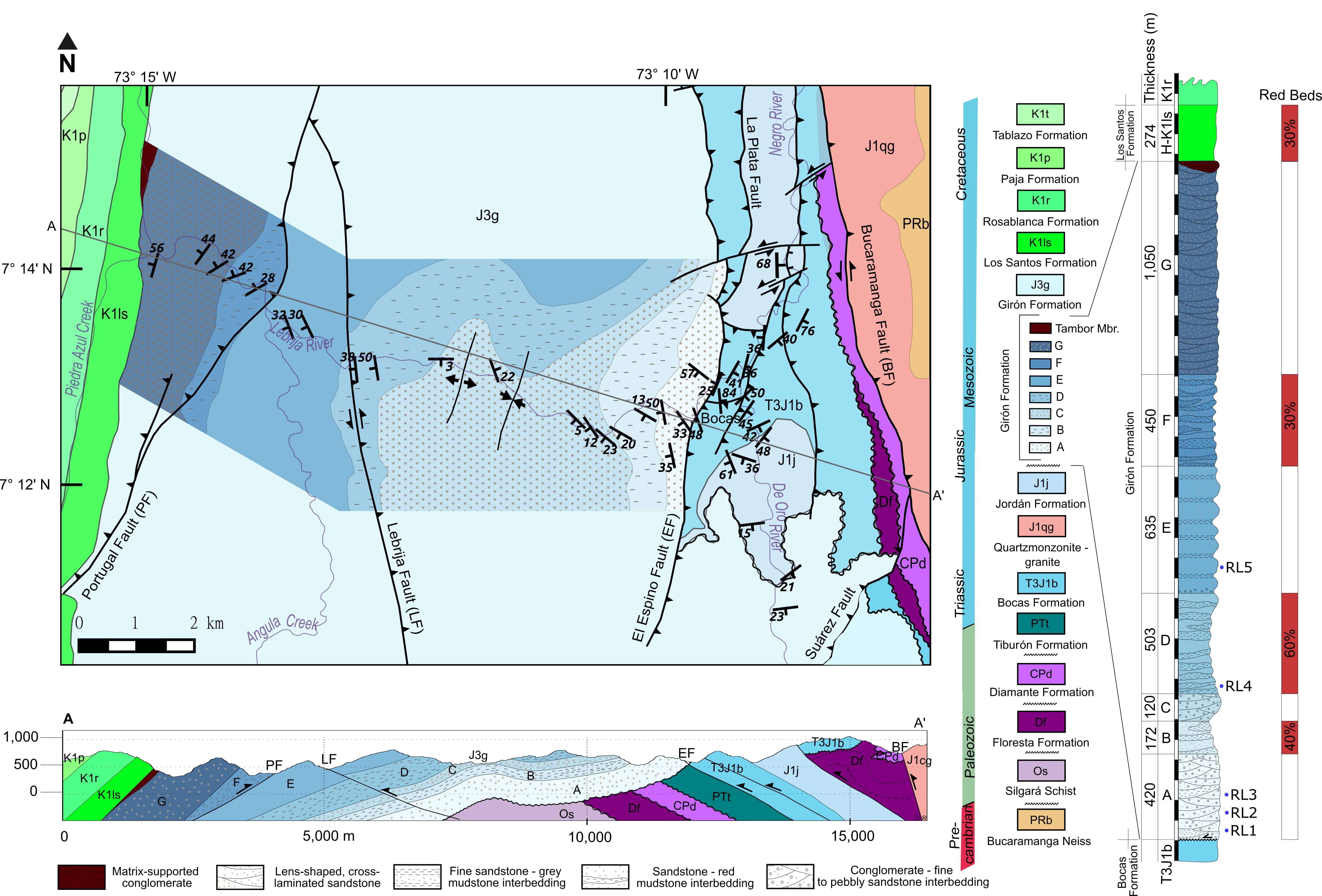 The core of the Yariguíes Anticlinorium is composed of a continental fluvial-alluvial sedimentary succession named Girón Group (sensu Cediel, 1968; Etayo-Serna, 1989) of Late Jurassic-Early Cretaceous age (Pons, 1982). The base of the Girón Group is the Girón Formation (Upper Jurassic) while the Los Santos Formation (Berriasian) constitutes the top (Cediel, 1968; Ward et al., 1973; Etayo-Serna and Rodríguez, 1985). The name Lebrija River Formation has been proposed by Etayo-Serna (1989) and Clavijo and Camacho (1993) in exchange for the name Girón Formation to avoid the homonymy between the two stratigraphic hierarchies involved (i.e., Girón Group and Girón Formation), and also considering the geographical location of the best preserved and most complete succession on the Lebrija River.