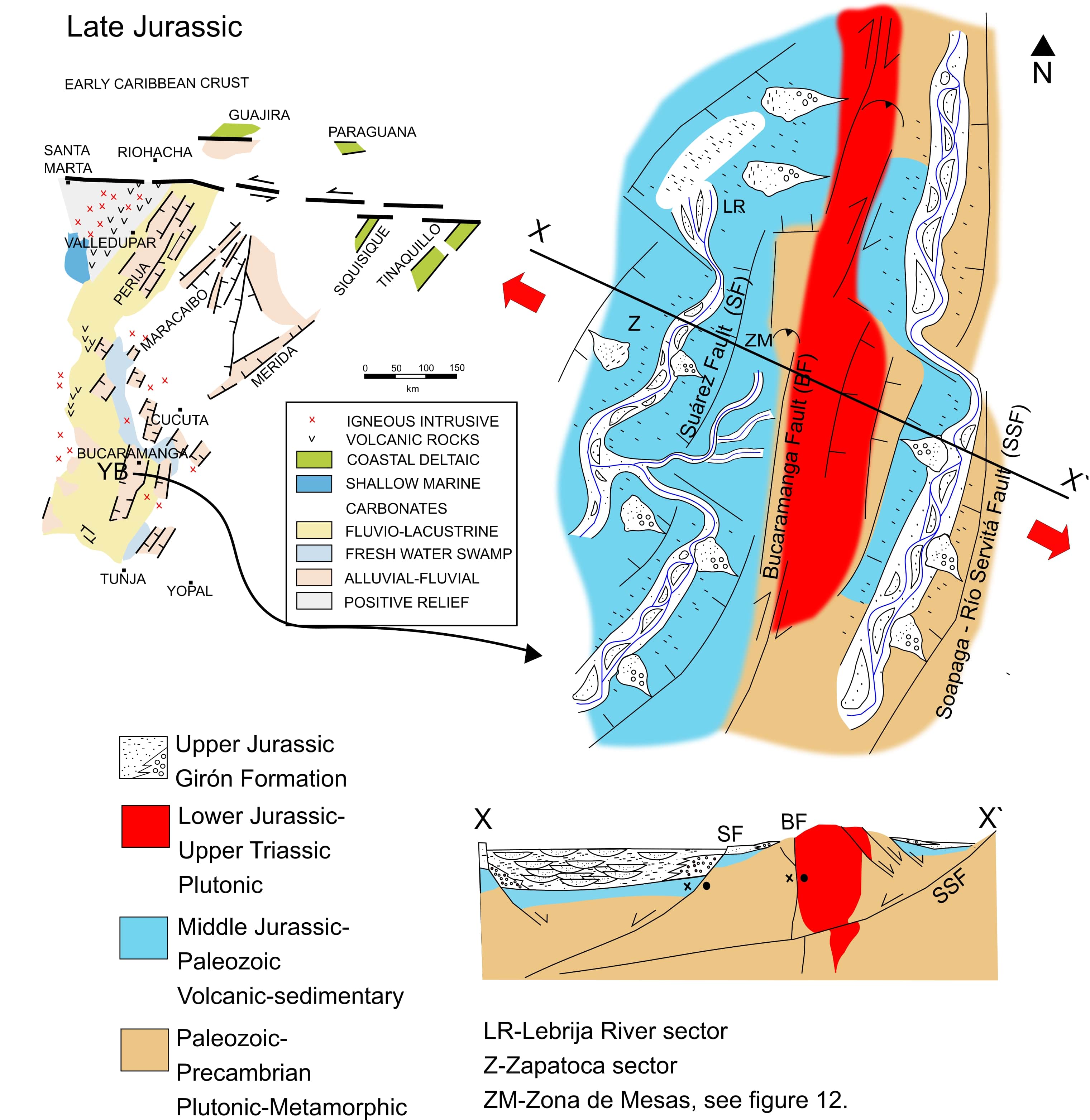The Jurassic stratigraphy has been a long-debated subject in the Colombian geological literature. Lateral and vertical correlations between sedimentary and volcanic units of this age are some of the most challenging topics, although several authors have attempted to establish valid correlations, no satisfying consensus has been reached. One clear example of these issues is the unique nature of the type section of one of the most well-known Upper Jurassic sedimentary units: the Girón Formation. This type section is different in fundamental stratigraphic aspects (e.g., thickness, architecture and facies successions) from all the other similar aged successions, precluding valid regional correlations. However, these differences can also be seen as tools for reconstructing a plausible scenario in which all the data can be conciliated. This has been achieved for some Jurassic basins located in Colombia and Mexico. In the Guajira Peninsula of Colombia, the Jurassic sedimentary rocks of the Cosinas Group have been interpreted as the result of the infilling of one of multiple sub-basins created by Pangea’s break-up (Nova et al., 2019). Units with similar characteristics to those of the Girón Formation are reported in Mexico for the Middle Jurassic (e.g., Todos Santos Formation, Huizachal Formation). They are interpreted also as the infilling of extensional basins (Michalzik, 1991; Godínez-Urban et al., 2011) located adjacent to the limit between Laurentia and Gondwana during Pangea’s rupture, in the Middle-Late Jurassic (Martini and Ortega-Gutiérrez, 2016; Nova et al., 2019). Despite this, only the magmatic evolution of the basins is considered in most North-Andean Jurassic tectonic models (Spikings et al., 2015; Zuluaga et al., 2015; Bustamante et al., 2016; Rodríguez et al., 2018; Zuluaga and López, 2019); therefore, they lack a description of the sedimentary environments and their variations. Other studies try to conciliate all the geological data into different plausible tectonic models but lack a detailed scenario of each of the involved units (e.g., Martini and Ortega-Gutiérrez, 2016; Bayona et al., 2020).