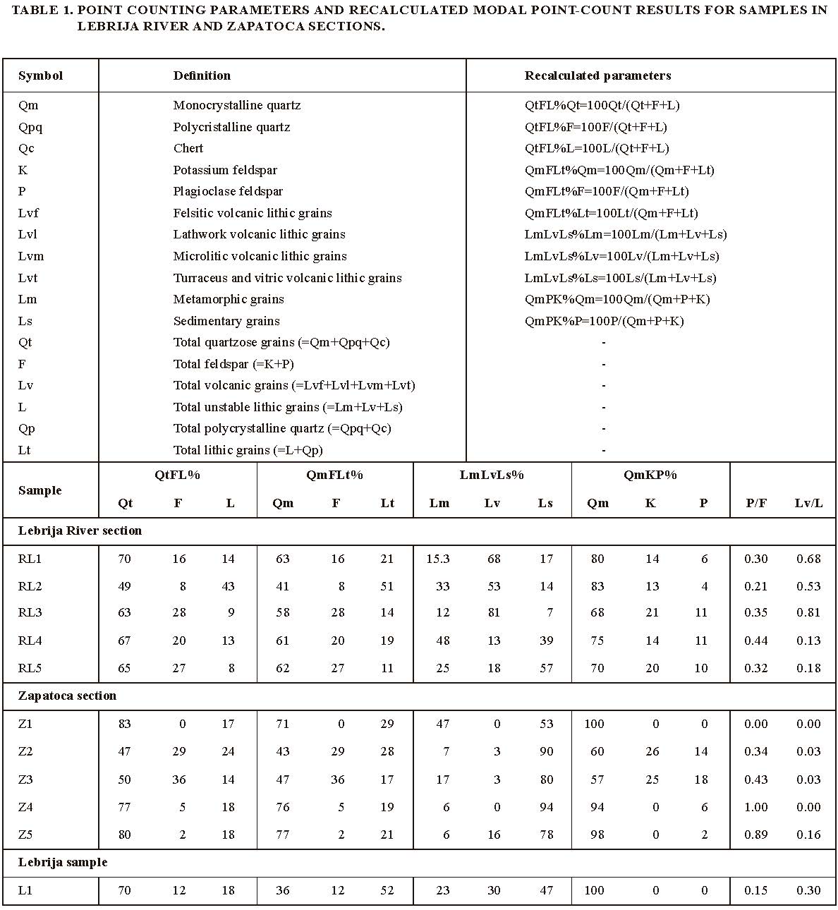 Eleven sandstone samples were taken for petrographic analysis, five from the Zapatoca section and five from the Lebrija River section. One sample was obtained near Lebrija for comparison. A 400 point counting was made in each sample using the Gazzi-Dickinson methodology (Ingersoll et al., 1984), with the criteria given in (Tabla 1).