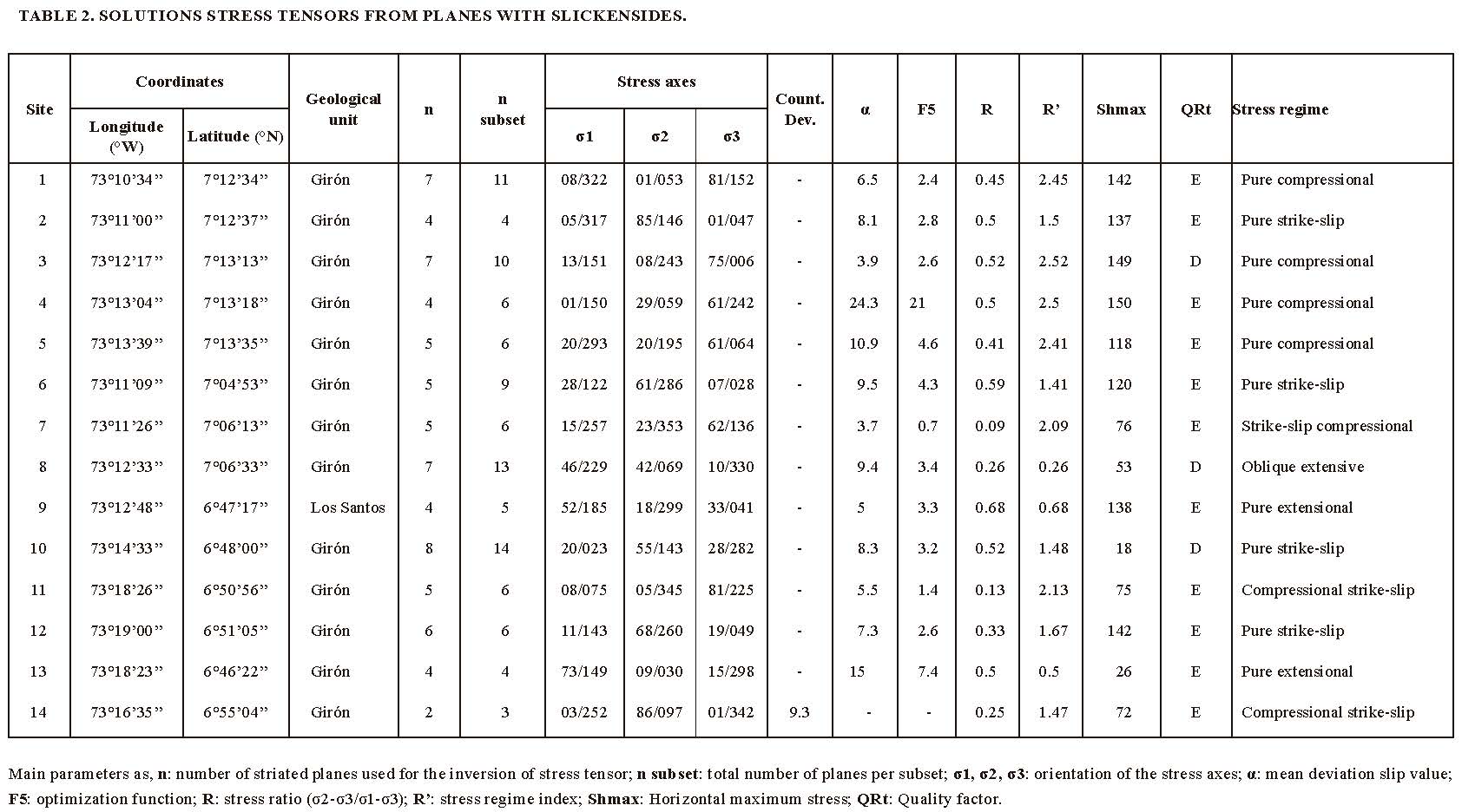 For discussion of the tectonic implications of the stress tensor results it is necessary to consider that with the exception of one locality, all the collected data in Zapatoca and Lebrija River areas were measured in rocks of the Girón Formation. Limitations of the results can be related to low amount of measured data in some sites, and some stress tensors are probably more associated with local kinematics.