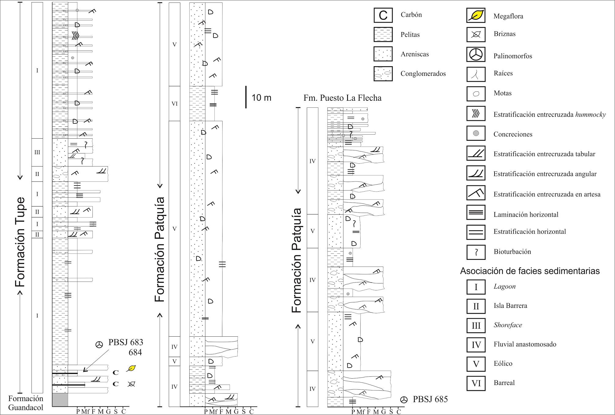 Interpretación: Se interpreta que esta asociación de facies fue generada por 2 diferentes procesos sedimentarios. Por un lado, los depósitos de pelitas mayoritarios en la asociación, con intercalaciones de carbón serían producto de flujos de baja energía, con baja capacidad de transporte y predominio de la decantación. La notoria bioturbación que caracteriza esta asociación puede ser interpretada como el resultado de un ambiente con aporte clástico pobre o discontinuo, lo cual genera condiciones propicias para el desarrollo de vida vegetal (Biozona NBG). La abundante bioturbación que presenta esta asociación de facies, muy probablemente, indicaría la acción de organismos que habrían descompuesto gran parte de la materia orgánica y destruido el arreglo interno de los sedimentos. Por otro lado, los cuerpos de areniscas tabulares, de morfologías simples pueden interpretarse como parte de sistemas unicanalizados, posiblemente sinuosos, que aportarían sedimentos a los cuerpos estancos descritos anteriormente. Además, las areniscas finas laminadas, muy bioturbadas con estratificación entrecruzada del tipo herring-bone, indicarían flujos bidireccionales (Reineck, 1975; Tankard y Hobday, 1977; Datta et al., 1999), probablemente de ambiente de lagoon. Estas litofacies que Cuerda y Furque (1981) interpretaron como de paleoambiente fluvial meandroso con niveles palustres, son a su vez compatibles con sistemas depositacionales de lagoons. La última asociación de facies de la Formación Guandacol interpretada por Perez Loinaze et al. (2011) como barras costeras alternadas con pantanos, sería congruente con la posterior formación de lagoons.