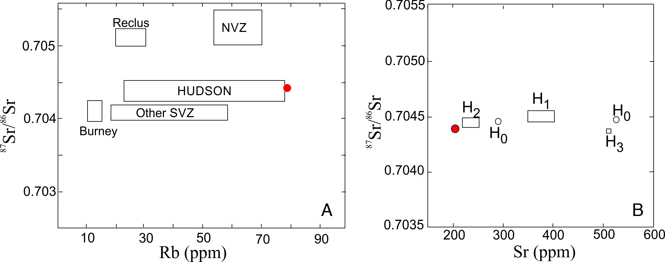 Fig. 5. A. 87Sr/86Sr versus Rb diagram, field for different volcanoes after Naranjo and Stern (1998); B. 87Sr/86Sr versus Sr diagram for the main Hudson explosive eruptions (after Weller et al., 2014). Burney and Reclus are from the Austral Volcanic Zone (Stern, 2008). Red point from Caleta Olivia tephra. |
