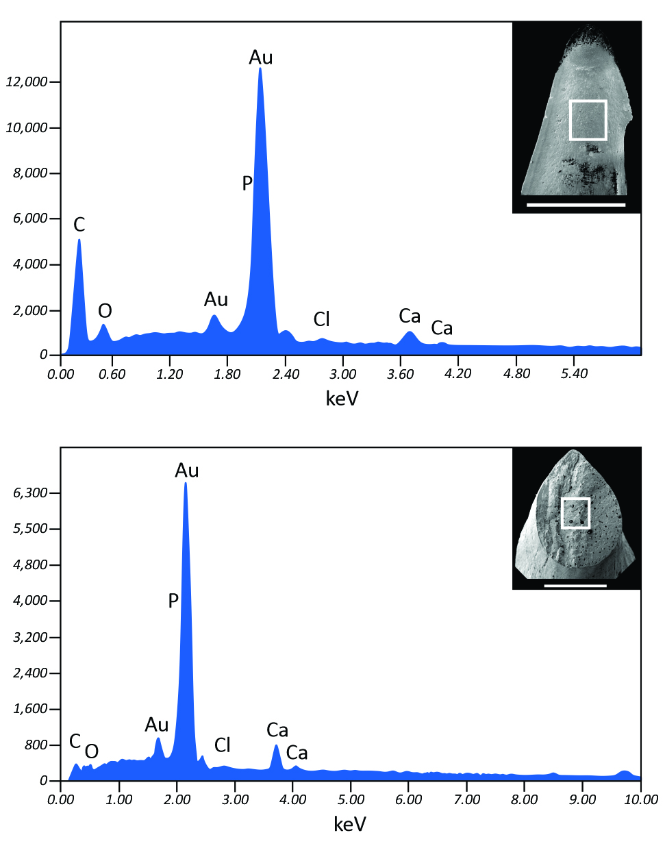 The facies seem to have allowed the mineralogical preservation of the crystalline material that composes the teeth. This is confirmed by the analysis of major chemical elements carried out at the tooth crown surface (Fig. 3A) and tooth pulp cavity (Fig. 3B).