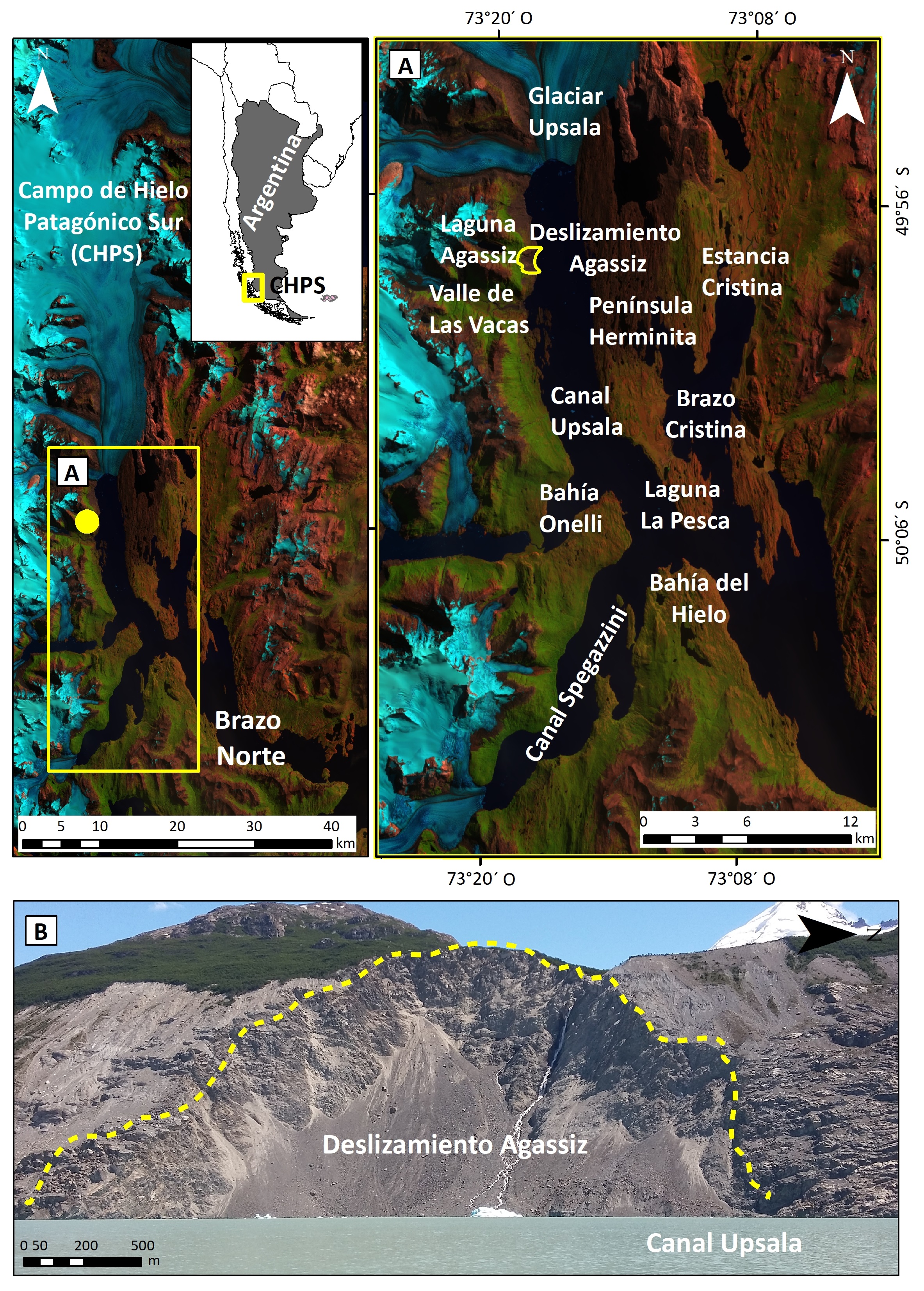 Durante el verano del año 2013 se generó un deslizamiento de gran magnitud sobre la ladera oeste del canal Upsala, correspondiente al brazo norte del lago Argentino, en Santa Cruz, Argentina. Este deslizamiento que se ha denominado Agassiz, se situó en la zona inferior de la laguna proglacial Agassiz, ubicada en la base del cerro Mc Andrew, próximo al valle de Las Vacas y al frente del glaciar Upsala (Fig. 1). El área de estudio está localizada a ~90 km de la ciudad de El Calafate, y únicamente es accesible por vía lacustre, con embarcaciones provenientes desde el puerto Punta Banderas (a 47 km de la ciudad). Se estima que el evento se produjo en la noche del día 10 de febrero de 2013, dado que las embarcaciones turísticas que circundan la zona solo detectaron los efectos del evento al día siguiente.