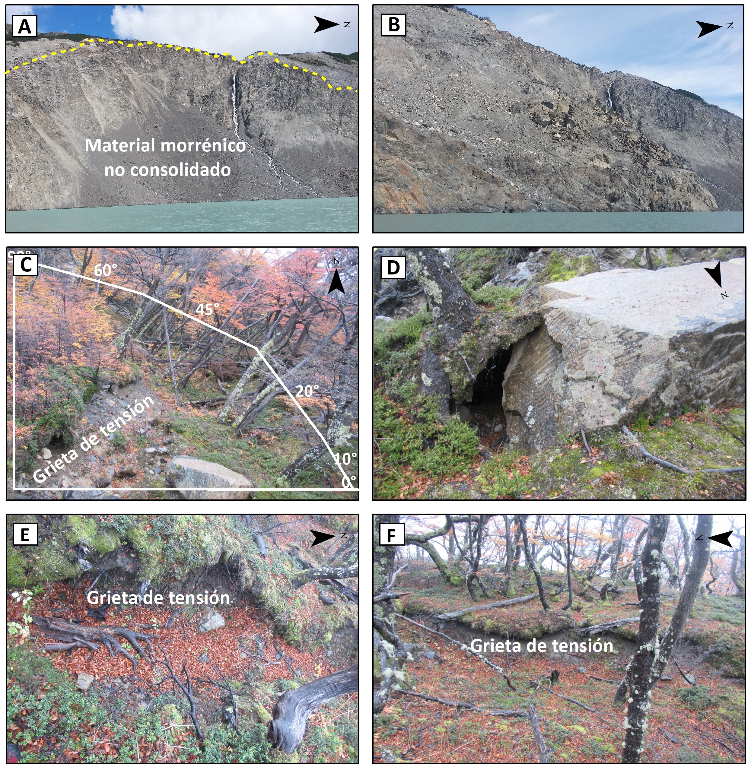 Por último, en los ambientes con reajustes paraglaciales como el canal Upsala en el brazo norte del lago Argentino existen otros factores condicionantes que favorecen la inestabilidad y los deslizamientos de las laderas, como la presencia de vegetación, con un denso bosque de Nothofagus. La masa boscosa continua determina la cobertura superficial de las laderas y evidencia más fácilmente las nuevas cicatrices de la inestabilidad. Además, tiene el potencial de actuar de anclaje a causa de su sistema radicular, respondiendo al área de contacto entre las raíces y el suelo, esto supone que el material morrénico situado más allá del límite inferior radicular no sea “retenido”. En algunas ocasiones, la vegetación puede significar una carga extra en la ladera que incrementa el esfuerzo de cizalla y la presión del agua en los poros, permite la percolación profunda de agua y, en efecto, produce inestabilidad (Wu y Siddle, 1995). En la ladera oeste del canal Upsala, los árboles se encuentran inclinados y derribados a favor de la pendiente con una inclinación promedio de ~20-10º respecto a la vertical (Fig. 7C), evidenciando un claro proceso de reptación de suelos que se produce en la parte superior de la zona afectada por el deslizamiento (Fig. 7D). Este sector de la ladera presentaba formación de múltiples grietas extensionales sobre el material morrénico con anterioridad al evento de remoción en masa. Actualmente, la ladera tiene un sistema de grietas de tensión longitudinales y transversales a la pendiente (Fig. 7E) que forman grandes socavones en el terreno, y generan lomadas de ~2 m (Fig. 7F). Comparando el dinamismo y los factores presentes en la ladera oeste del canal Upsala con las laderas de otras áreas, como los Andes Fueguinos afectados por la actividad glaciar, ambos presentan condiciones ambientales y efectos similares (Abascal y González Bonorino, 2015). El retiro de los glaciares durante el Pleistoceno en los Andes Australes dejó laderas de pendientes abruptas cubiertas de material morrénico y bosque de Nothofagus que las tapizan. Las laderas de los Andes fueguinos y del brazo norte se diferencian en la época de retiro de los glaciares, Pleistoceno y Holoceno, respectivamente. Sin embargo, a pesar de la diferencia de edades en el retiro de las masas de hielo, actualmente ambas zonas presentan laderas con procesos de remoción en masa activos (Abascal y González Bonorino, 2015).