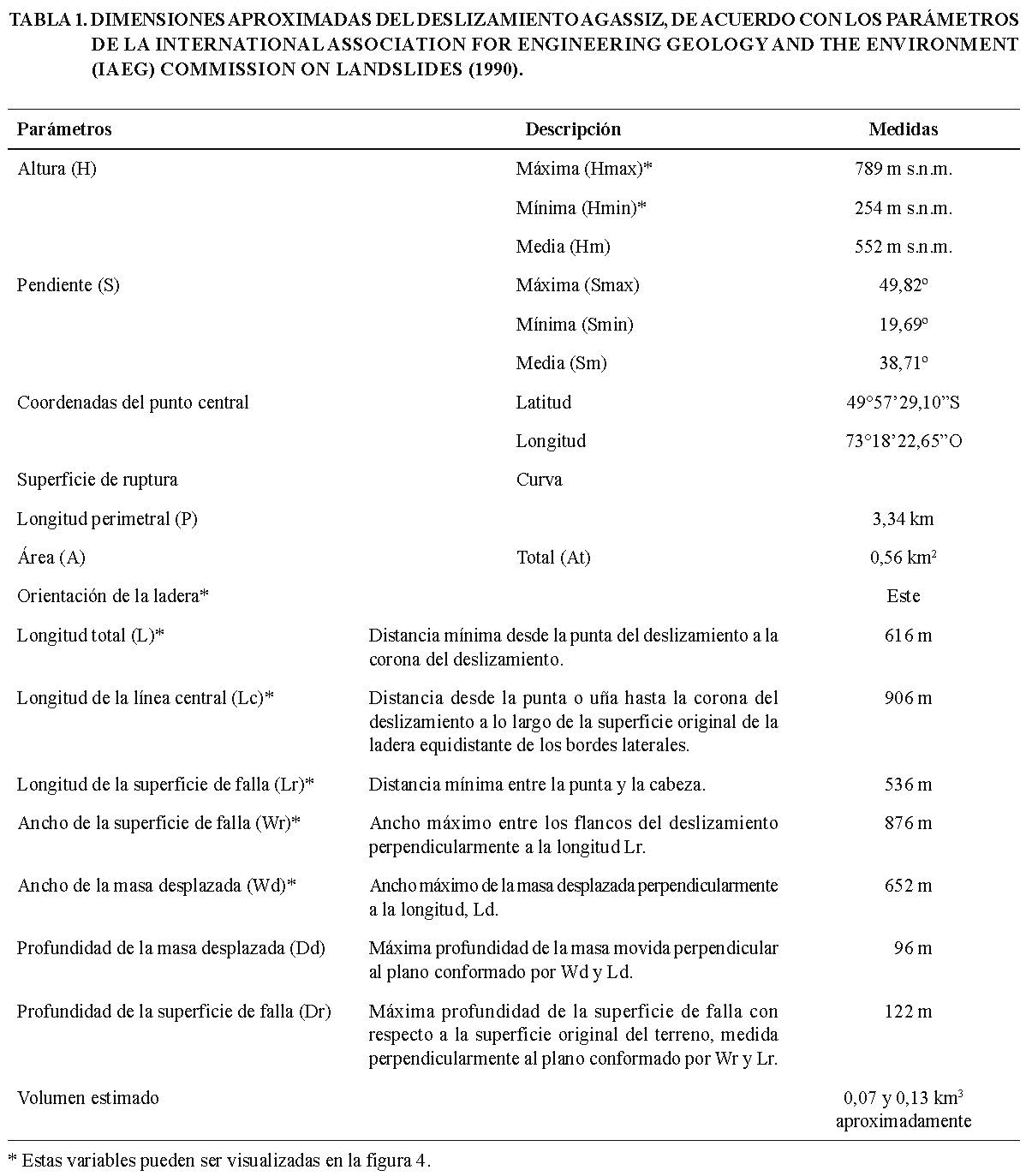 El análisis posterior al evento presenta limitaciones debido a la escasez de registros del momento en que ocurrió, se adiciona el condicionamiento de que parte del material desplazado se encuentra bajo el agua del canal Upsala. Durante el evento, se movilizó una sola masa direccionada por la pendiente con una superficie de falla curva y cóncava, depositando el material desplazado (e.g., suelo, sedimento y árboles desprendidos del bosque) en el lago. En el coronamiento del deslizamiento (~375 m de ancho) el desplazamiento fue del tipo semivertical y formó la escarpa principal que dejó expuesto el sustrato rocoso de volcanitas de la Formación Complejo El Quemado (Ghiglione et al., 2009; Lo Vecchio et al., 2016) (Fig. 1B). El punto más alto de la corona (cima) se encuentra a 789 m s.n.m. (Fig. 4) y su eje mayor está orientado hacia el este, con un área de 0,56 km2; posee una longitud total (L) estimada de 616 m y un ancho (Wr) de 876 m (Tabla 1). Según observaciones, en la zona del desprendimiento el material es más fino y suelto, donde se generan constantes movimientos y caídas de detritos de menor tamaño. La pendiente en la ladera es pronunciada (~45º), el desnivel existente entre la corona (Hmax-789 m s.n.m.) y la zona más baja en contacto con el agua del lago Argentino (Hmin-254 m s.n.m.) es de 535 m. Las características del sitio donde se produjo el deslizamiento sugieren que este podría haber sido rápido, repentino, del tipo rotacional (Varnes, 1978), que deslizó la masa completa de material, suelos, sedimentos, rocas y árboles de forma súbita hacia el agua del canal.