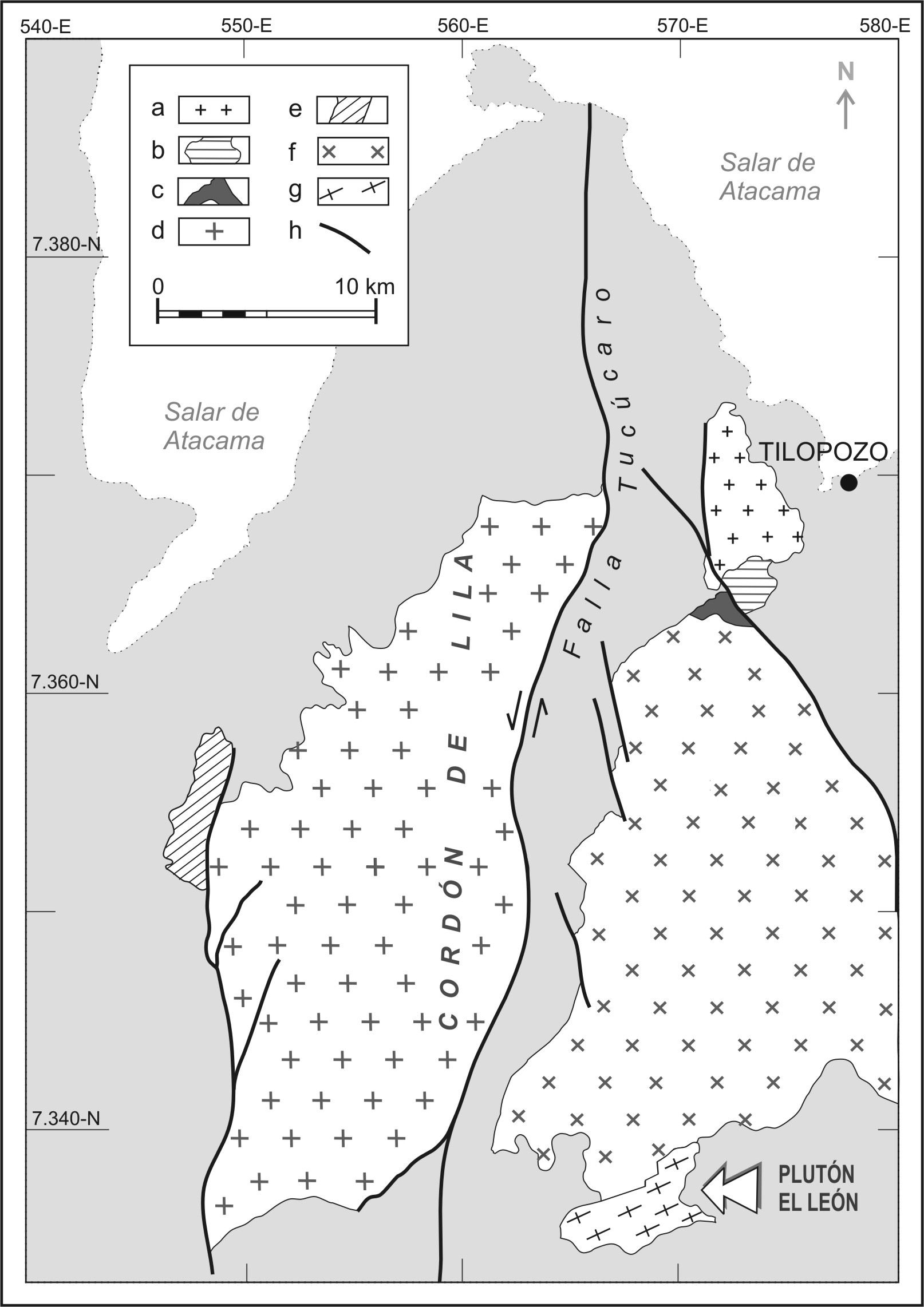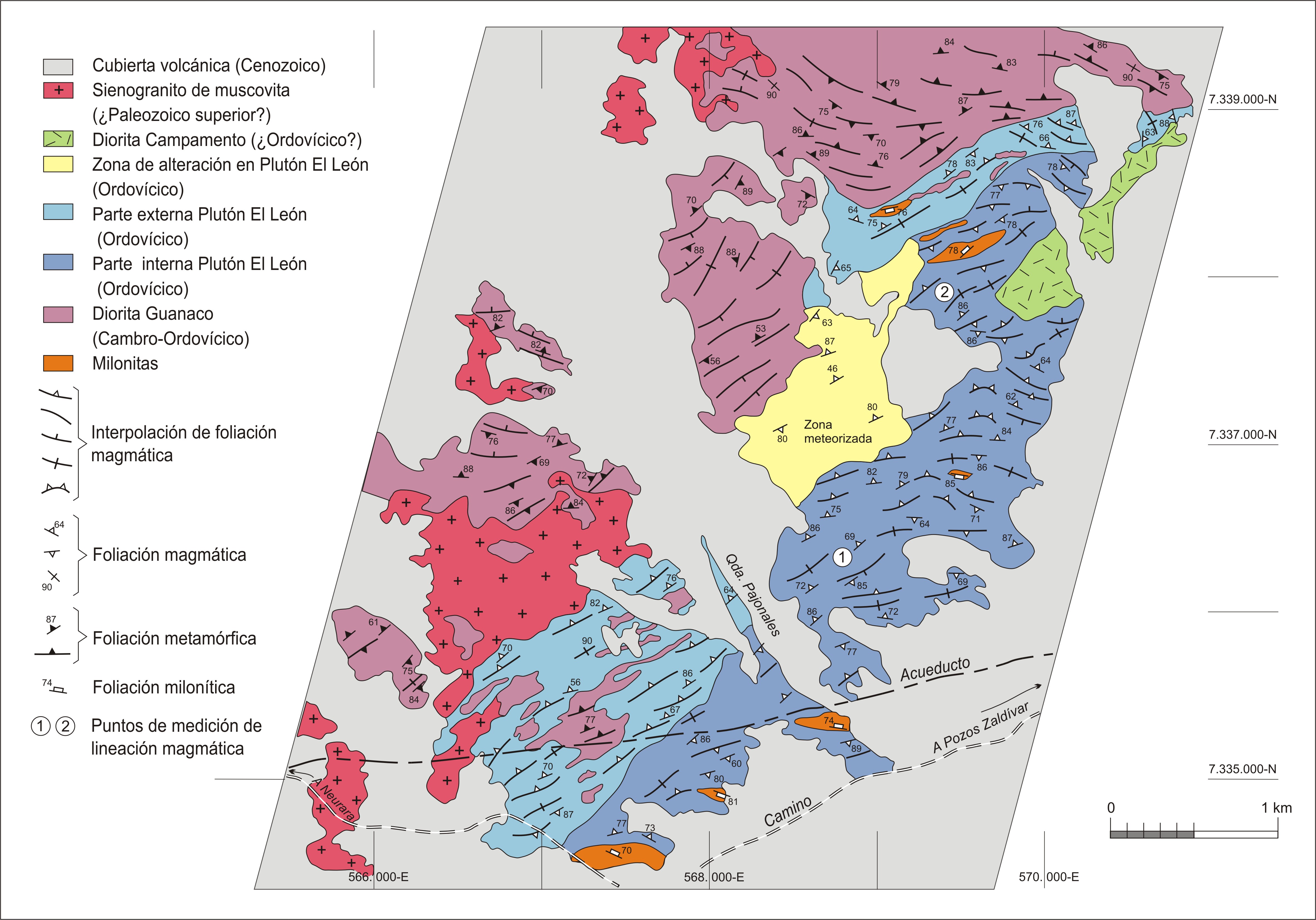La mayoría de los plutones ordovícicos (ca. 483-475 Ma) del Cordón de Lila son cuerpos intrusivos de carácter post-tectónico emplazados en la epizona (Valencia, 2014). La excepción está constituida por el Plutón El León (467 Ma), que es el único que presenta deformación sinmagmática, materializada por una foliación magmática paralela a su elongación en dirección NE (Fig. 2).