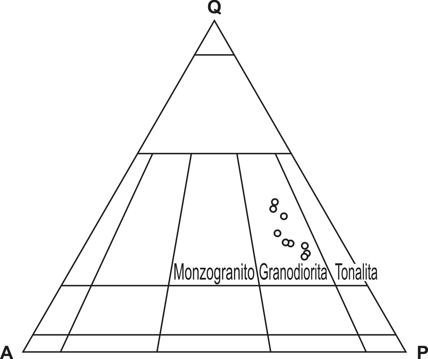 Fig. 3. Composición modal del Plutón El León en el diagrama QAP de Streckeisen (1974). Q: cuarzo; A: feldespato alcalino; P: plagioclasa.