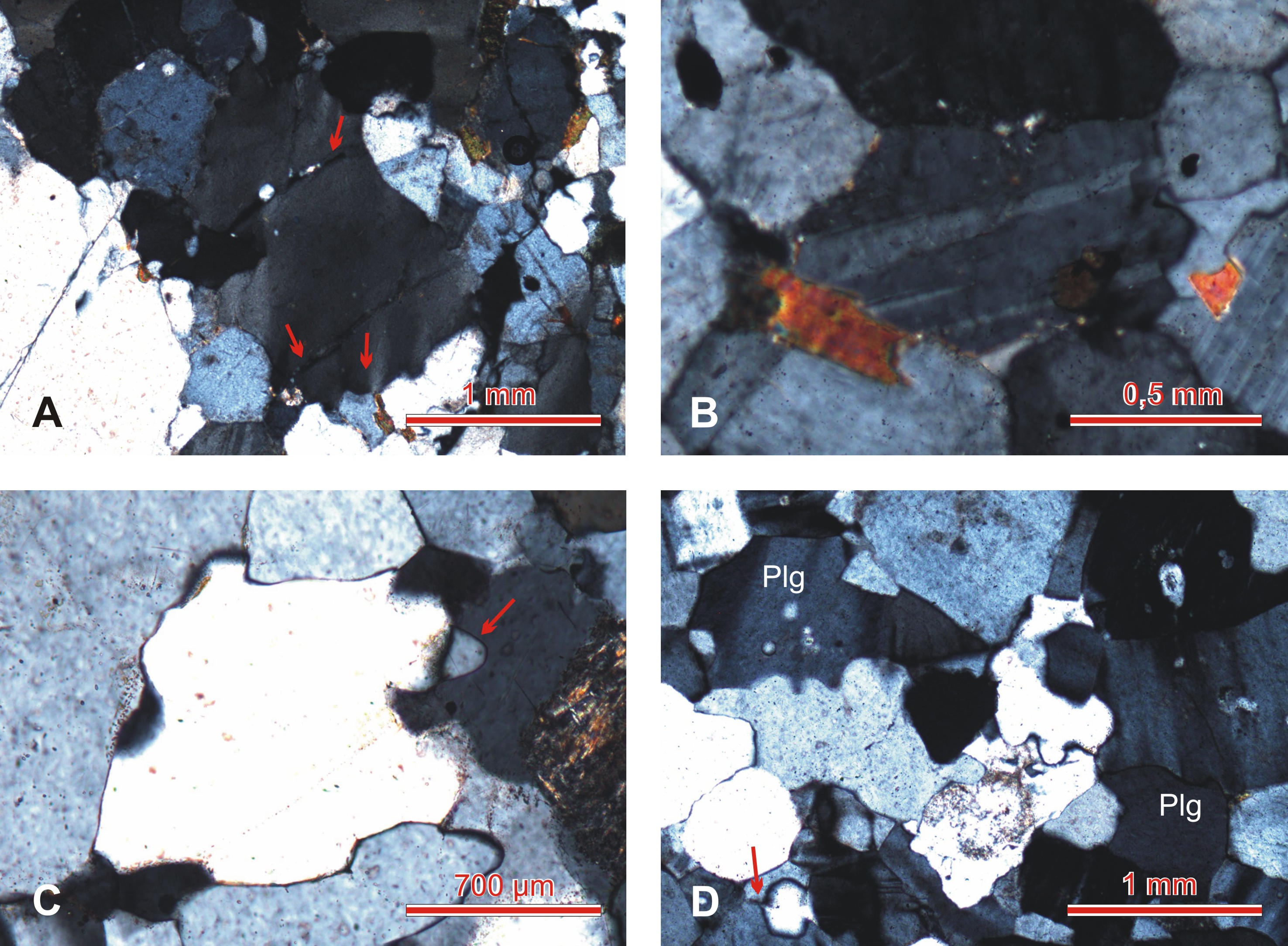 Existen fracturas de poca magnitud en los cristales de plagioclasa y feldespato potásico, al igual que en algunos cristales de cuarzo (Fig. 13D), lo que indica que la temperatura a la cual se produjo la deformación sólida de baja temperatura en el Plutón El León fue superior a 300 °C, ya que bajo este valor el comportamiento del cuarzo es completamente frágil (Fazio et al., 2020).