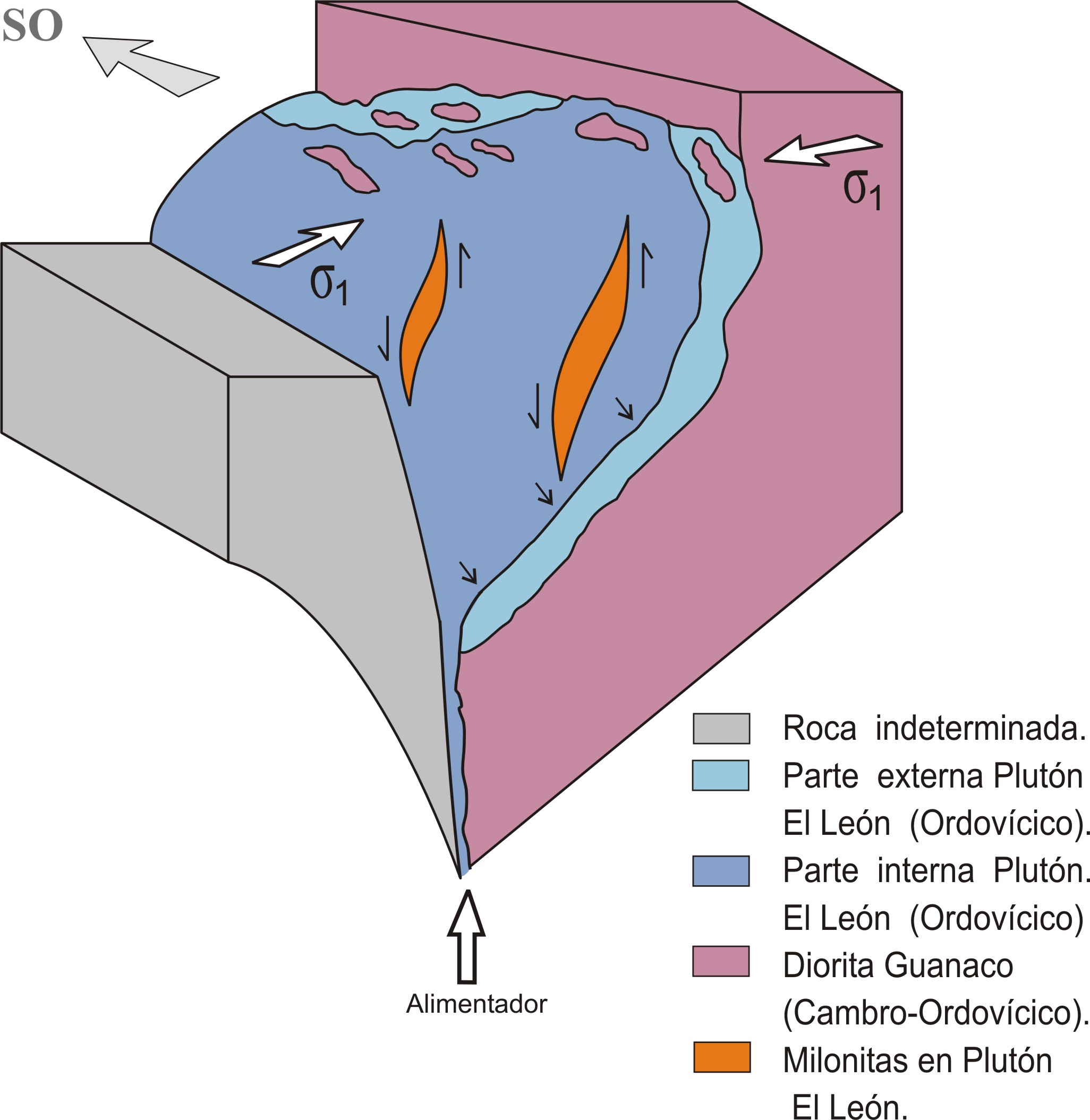 Finalmente, el desarrollo de milonitas con una deformación sólida tanto de alta temperatura como de baja temperatura, sumado al carácter sinmagmático de la deformación y una componente con carácter normal-sinistral, además de la forma tabular del plutón, son características que se ajustan al modelo de emplazamiento plutónico de tipo pistón descendente propuesto por Cruden (1998). El movimiento de pistón habría estado activo durante la última etapa de cristalización del Plutón El León y la mayor parte del espacio para el emplazamiento de este se habría producido por descenso dúctil de su piso (Fig. 15).