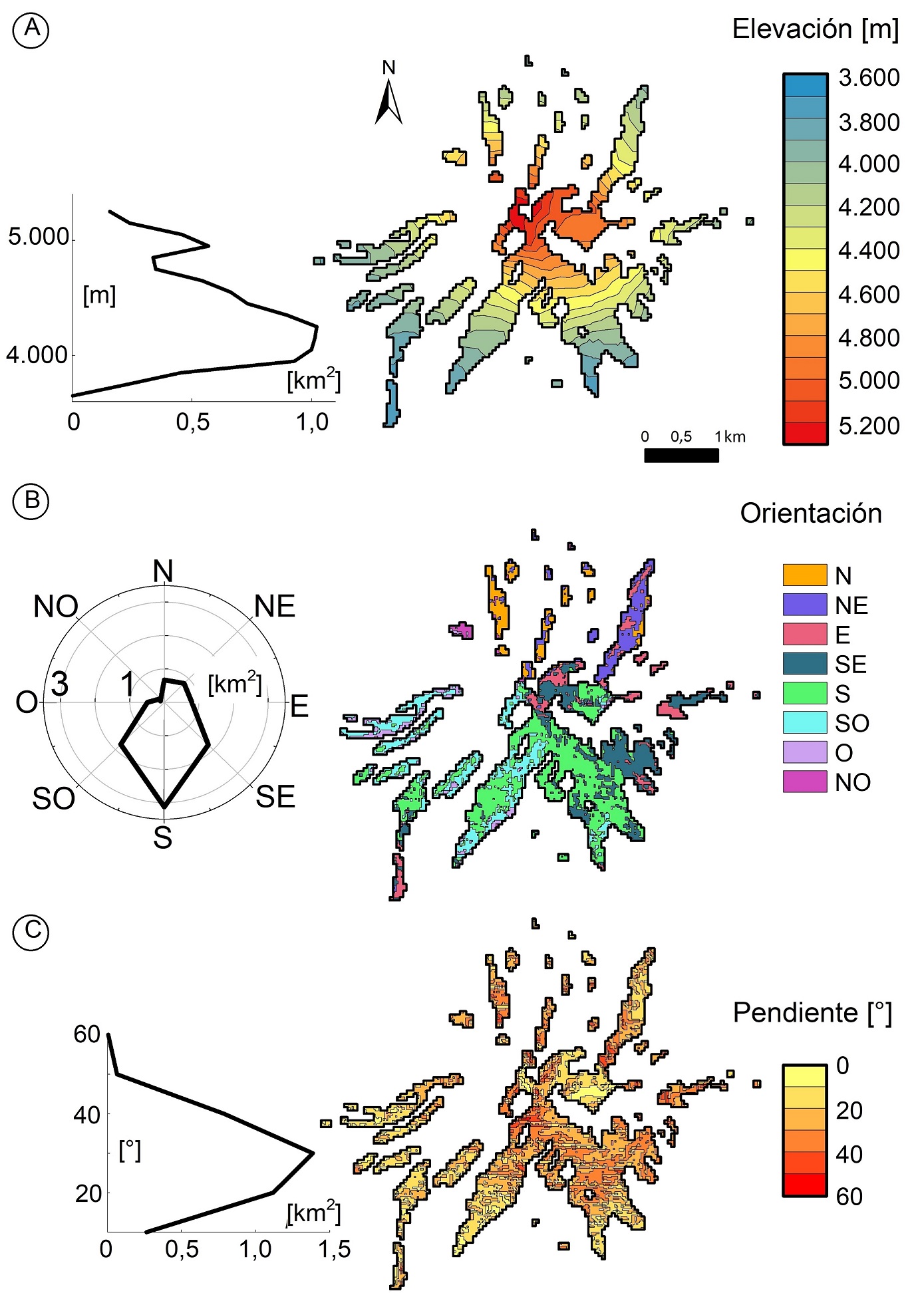 En términos absolutos, las mayores pérdidas ocurrieron en zonas orientadas al S, SO y SE, y alcanzaron los 1,3 km2 (1976-2020), sin embargo, representaron en promedio el 55% del área inicial de cada una de esas orientaciones (Fig. 5A). Esta situación fue diametralmente opuesta a lo ocurrido en los glaciares orientados al NO, N y NE que redujeron su superficie entre 0,2 y 0,7 km2, aunque representó en promedio el 85% del área inicial de esas orientaciones. Esas diferencias se tradujeron en las mayores tasas de reducción relativa al N y NE (~2%a-1) respecto de lo observado al S, ~0,9%a-1 (Fig. 5B y C).