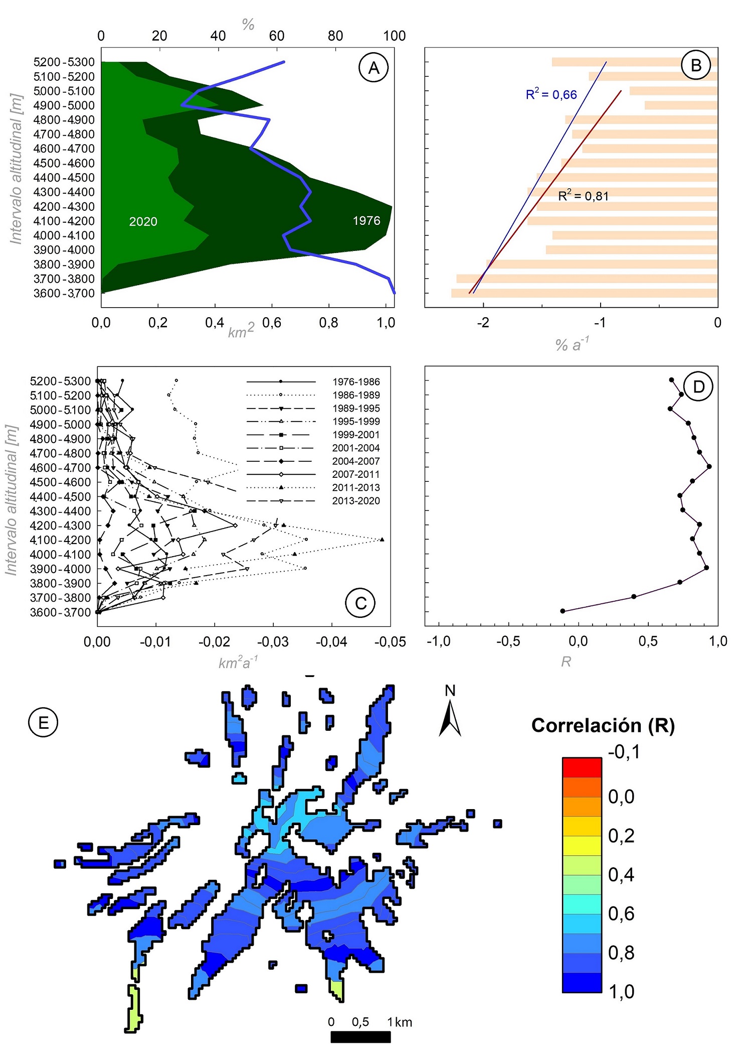 En cuanto a la correlación existente entre la tasa relativa (%a-1) de cambio de área glaciar total y la observada en los intervalos de elevación, el coeficiente R varió entre -0,11 y 0,94 (pvalue<0,05) lo que sugiere una amplia gama de particularidades al interior del cuerpo de hielo. Solo el área glaciar localizada entre los 3.900-4.000 m y 4.600-4.700 m mostró una fuerte correspondencia con la respuesta total (R>0,9). En ese sentido, es de notar que el 85% de la reducción del área glaciar ocurrió en intervalos altitudinales donde en promedio R=0,75 (Fig. 4D). Además, se descarta la existencia de un gradiente altitudinal en el grado de correlación, solo a partir del R máximo (0,94) ocurrido entre 4.600-4.700 m, este cayó progresivamente con la altura (Fig. 5E). Por último, es notoria la caída en la correlación (R=-0,14) de la zona topográficamente más baja (3.600-3.700 m), de lo que se infiere fuertes discrepancias entre lo regional y lo local.