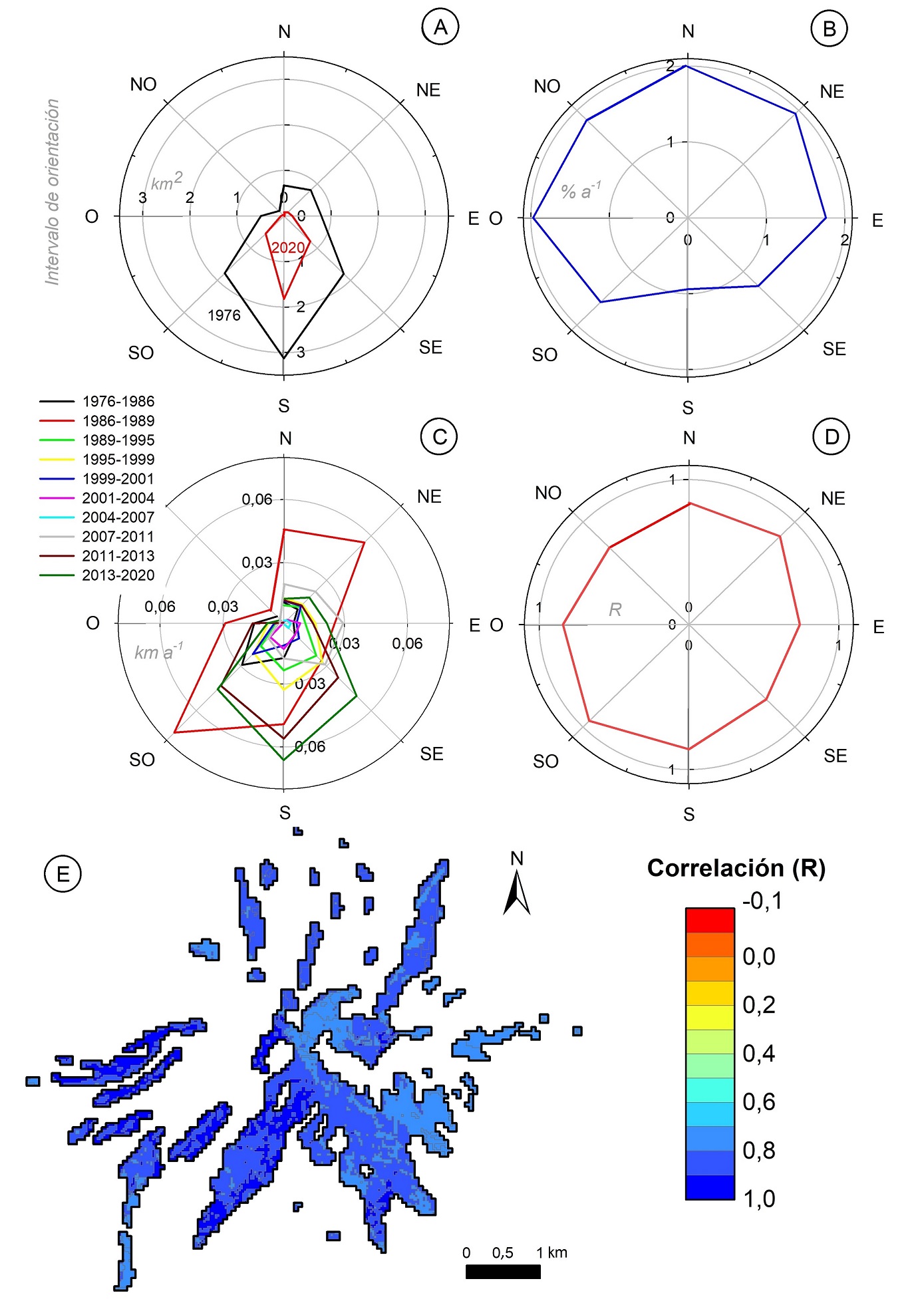 En lo referido a la correlación entre la tasa relativa (%a-1) de cambio de área glaciar total y las observadas en las diversas orientaciones, el coeficiente R varió entre 0,73 y 0,94 (pvalue<0,05). La superficie glaciar orientada al SO mostró el mayor coeficiente de correlación (R>0,94), y allí la reducción del área glaciar significó el 20% del total durante el periodo analizado (Fig. 5D y E). Por su parte, la porción glaciar orientada al NO, E y SE mostró una parcial correspondencia con lo reportado en términos de conjunto (0,73≤R≤0,75), y allí ocurrió el ~30% de la pérdida total de área glaciar entre 1976 y 2020.