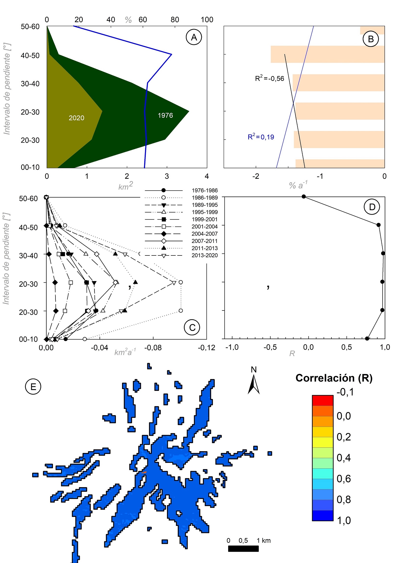 Finalmente, el análisis de correlación muestra un fuerte acople entre lo ocurrido en el total de la masa glaciar respecto de cada intervalo de pendiente (R>0,9) (Fig. 6D y E). De hecho, la ausencia de patrones espaciales sugiere un bajo o nulo control por parte de las pendientes sobre los cambios de área.