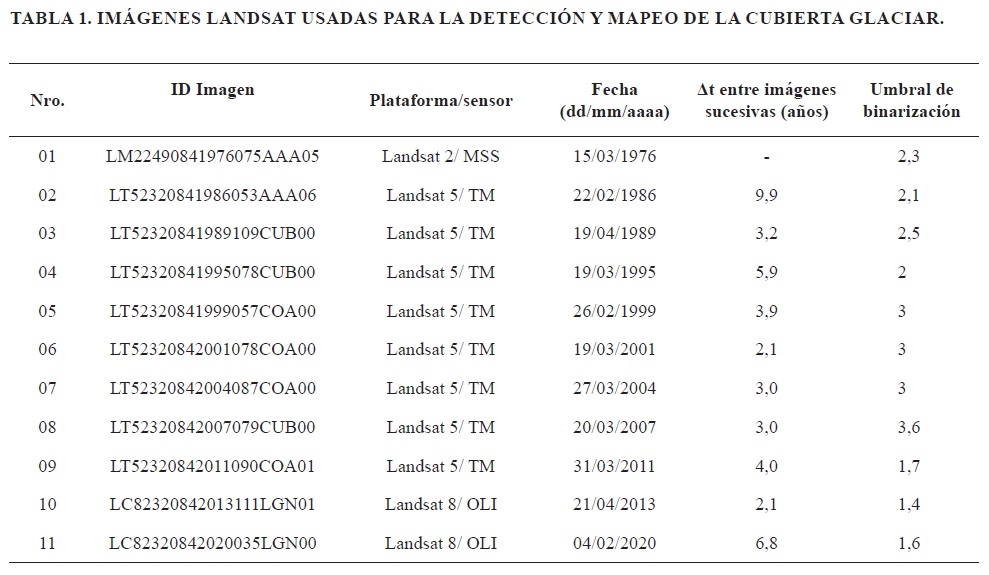 Con más de 30 años desde su inicio, el programa satelital LANDSAT (MS, TM, ETM+ y OLI/TIRS) ofrece un potencial único para el monitoreo de cambios en la criósfera (Cortés et al., 2014). En este estudio se usaron 11 imágenes LANDSAT (obtenidas del portal https://earthexplorer.usgs.gov) distribuidas temporalmente entre 1976 y 2020 (Tabla 1). Las escenas satelitales fueron descargadas como imágenes ortorectificadas (Nivel 1T), con sistema de referencia y proyección WGS84/UTM19S, respectivamente.
