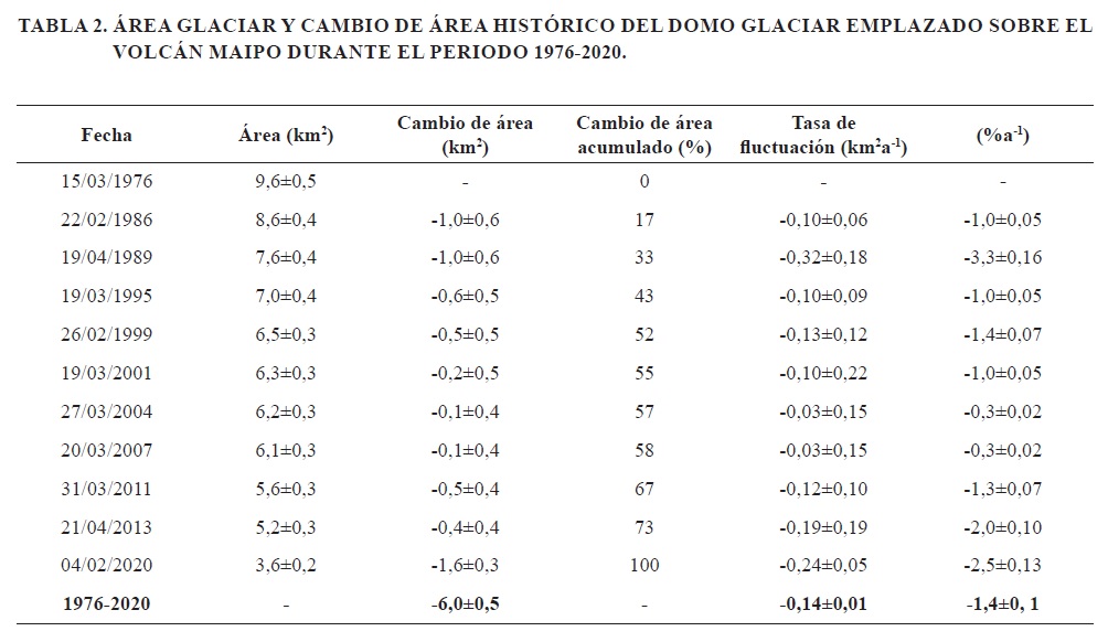 Entre los años 1976 y 2020 el glaciar del volcán Maipo perdió el 63% de la superficie inicial (9,6 km2) a un ritmo promedio de 0,14±0,01 km2a-1. Dicha reducción relativa es considerablemente superior a las encontradas en épocas similares en glaciares de los AC localizados más al norte como el Juncal norte y sur (16,2 y 14,3%, respectivamente), Olivares gamma y beta (16,2 y 29,8%, respectivamente) y Alto del Plomo (17,8%) (Bown et al., 2008; Malmros et al., 2016; Zazulie et al., 2017). Solo los glaciares Vacas (42,9%) y Gussfeldt (58,5%) experimentaron pérdidas similares (Espizua y Pitte, 2009).