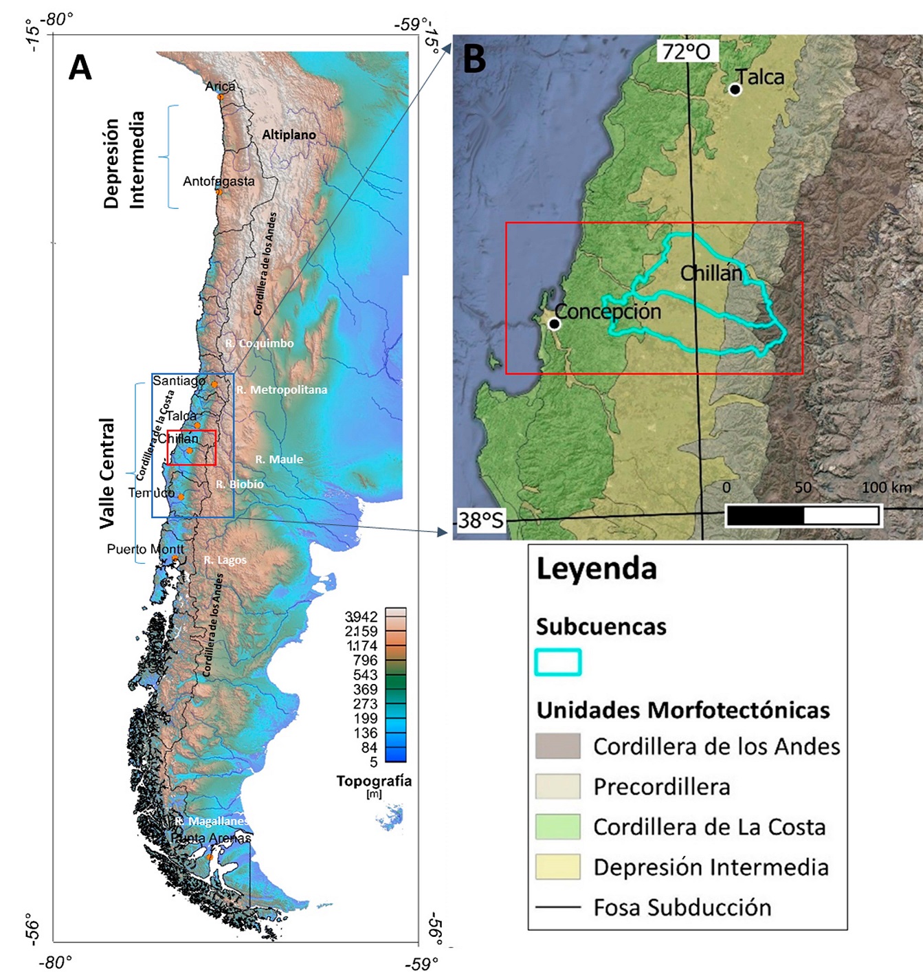 Geomorfológicamente, el área de estudio comprende las unidades de precordillera y valle central (Fig. 1). El valle central es una cuenca de antearco de naturaleza tectónica, con un relleno sedimentario de origen diverso: variando de fluvioglaciovolcánico a glaciovolcánico y con materiales lacustres de norte a sur (SubdereUniversidad de Concepción, 2014). Presenta un ancho máximo de 74 km al norte del río Laja y cerca de 40 km en el sector de Chillán. La precordillera está constituida por rocas y depósitos de origen sedimentario, de material glacial, volcánico y fluvial, ubicada en lado occidental de la cordillera de los Andes, con alturas máximas de 850 m s.n.m.