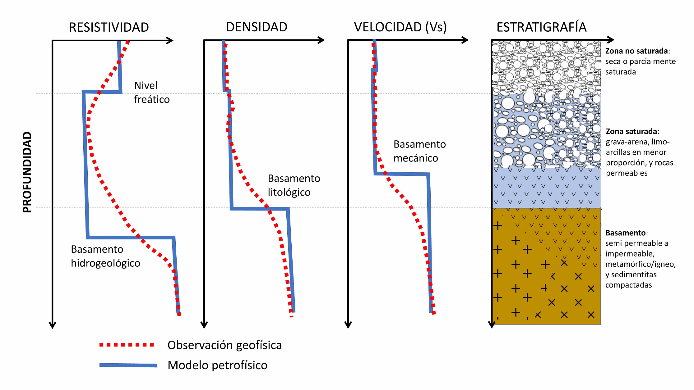 En la figura 2 se presenta un perfil genérico de resistividad, determinado desde la superficie del terreno o al interior de un pozo, y los cambios de valores conforme varía el grado de saturación y litología. Se pueden apreciar tres dominios característicos: (1) un nivel somero relativamente conductor hasta el nivel freático, (2) seguido de un estrato conductor desde el nivel freático hasta (3) un nivel impermeable o de basamento resistivo. Esta representación esquemática, en principio muy simple si se dispone de mediciones de pozo, en la práctica se complica en la ejecución de un levantamiento geofísico por efecto de mediciones a distancia y por diversos factores hidrogeológicos, tales como: porcentaje de saturación en la zona vadosa, tipo de sedimento, granulometría, nivel de compactación de los sedimentos, grado de impermeabilidad del basamento, salinidad de la solución acuosa, entre las más importantes. Para acotar esta variabilidad es fundamental disponer de información hidrogeológica y datos aportados mediante técnicas geofísicas complementarias (e.g., método sísmico, ondas compresivas y de cizalle, y magnético). Complementariamente se incluye la variación en la densidad y velocidad de ondas superficiales que presentan los materiales, y que se usan como base para la interpretación de las prospecciones gravimétricas y sísmicas de superficie.