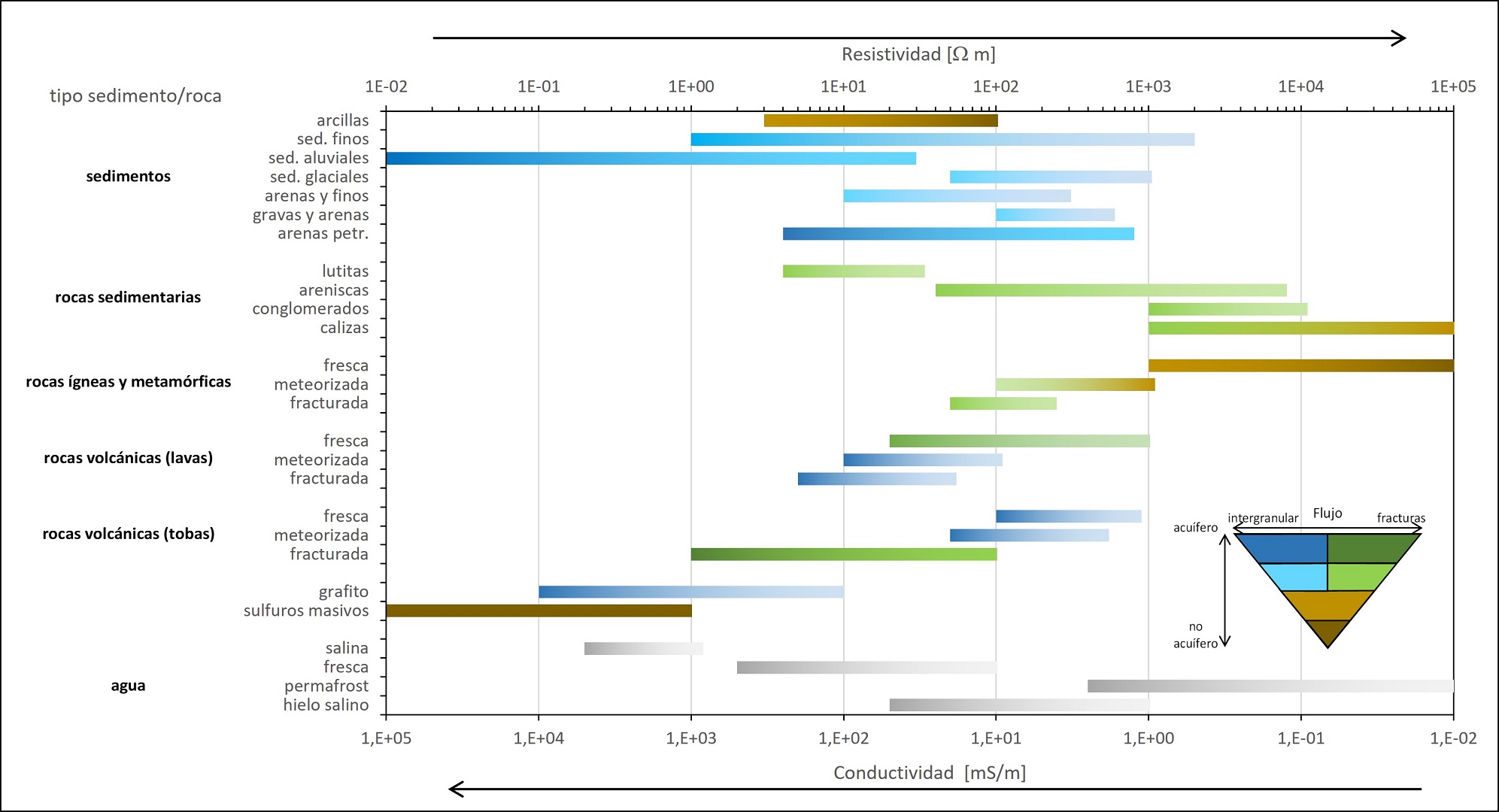 Adicionalmente, en la literatura científica existen numerosas reseñas referidas a valores de resistividad de los diferentes materiales y unidades de interés hidrogeológico, que muestran una gran variabilidad. En consecuencia, las resistividades de cualquier levantamiento de terreno se deben interpretar de acuerdo con las particularidades hidrogeológicas de cada uno de los sitios por estudiar. En la figura 3 se presentan los resultados de una compilación de resistividades medidas en ambientes de cuencas hidrológicas andinas complementadas con valores de resistividad de materiales característicos para estos ambientes. Se incluyen rangos de valores asociados a la posible presencia de acuíferos para sedimentos, rocas ígneas y metamórficas, rocas volcánicas, minerales característicos y agua con diferentes salinidades y/o estado de congelamiento. La simbología de colores se basa en los conceptos presentados por Struckmeier y Margat (1995) para la elaboración de mapas hidrogeológicos, con el fin de acotar la potencial ocurrencia de acuíferos, acuitardos, acuícludos o acuífugos de acuerdo con los valores de resistividad detectados. La confirmación de esta propuesta de interpretación debe realizarse con estudios y evidencias hidrogeológicas complementarias, especialmente aquellas resultantes de perforaciones.