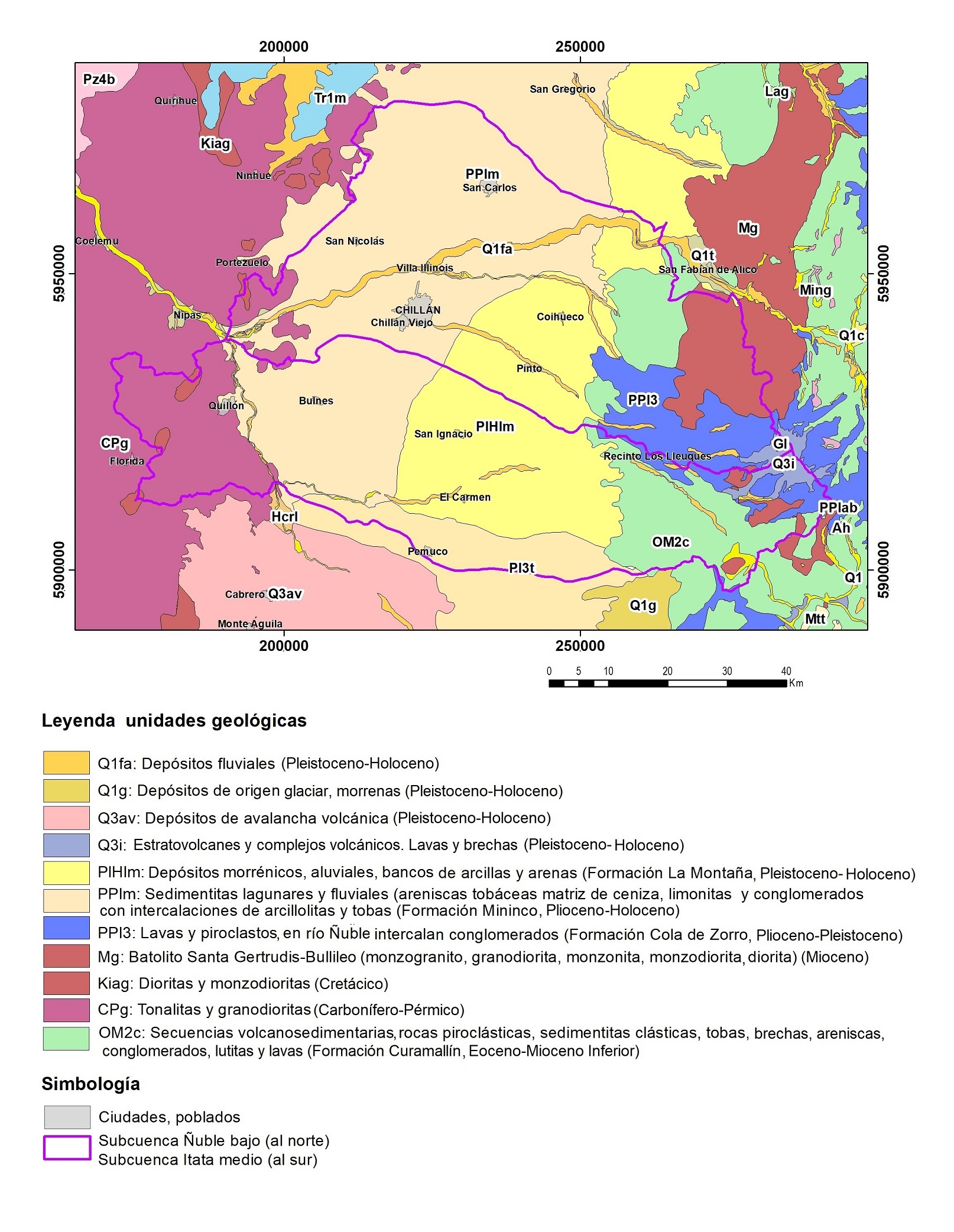 En el estudio hidrogeológico de las cuencas Biobío e Itata (DGAAquaterra, 2011) se reconoce la existencia de un acuífero formado principalmente por depósitos finos y cuyas variaciones de permeabilidad laterales y en profundidad permiten diferenciar dos subunidades: Unidad A para los reducidos sectores de mediana a alta permeabilidad y Unidad B para los sectores de permeabilidad media a baja que son los más representativos. Adicionalmente, se han identificado sectores de afloramientos y/o recuperaciones del agua subterránea en algunos tramos de los ríos Ñuble, Cato, Chillán, Itata y Diguillín.