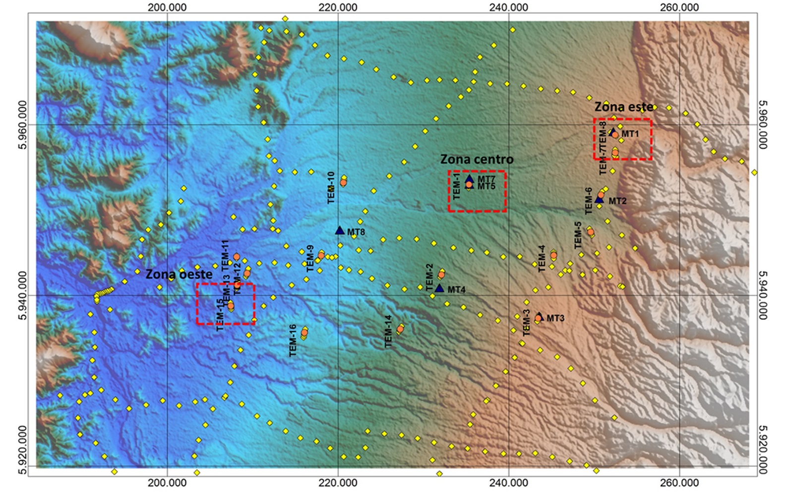 En el área de estudio se realizaron mediciones de TEM y MT con el fin de caracterizar el subsuelo a diferentes profundidades y, al mismo tiempo, tener un control cruzado entre las distintas metodologías utilizadas.