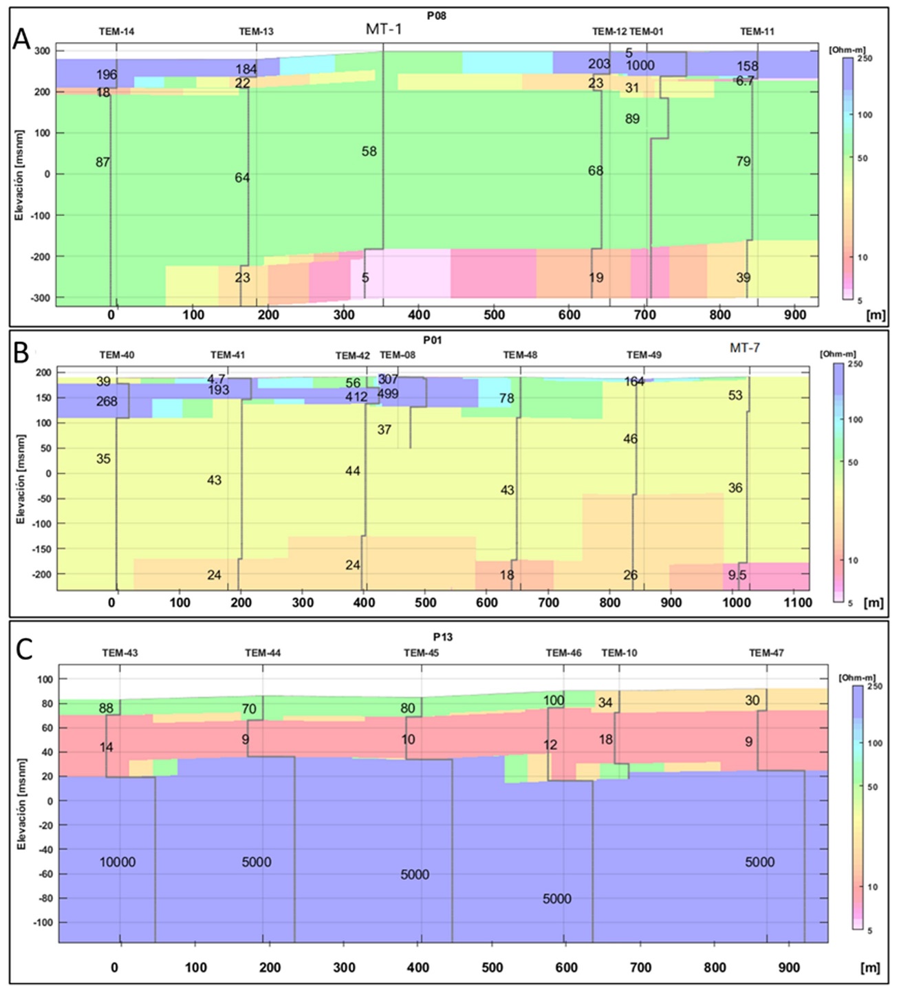 En el caso del TEM, los datos fueron procesados con el software TEM-Processing 1.0 y modelados con el software Model 3.0, ambos partes del equipo FastSnap-TEM de AlphaGeoscience. La modelación es 1D y en el caso de los perfiles conformados por varias estaciones TEM, los resultados corresponden a una representación conjunta de las distintas mediciones del perfil utilizando una rutina in-house desarrollada por la empresa Subterránea Consultores. La figura 7 muestra el producto de la modelación de los datos de TEM para tres perfiles característicos de las zonas este, centro y oeste del área de estudio. En cada perfil, los colores corresponden a la grilla únicamente de los modelos de 200 m. Además, se muestran los modelos individuales resistividad-profundidad de cada una de las estaciones TEM que conforman cada perfil. En general, cada perfil de loop 200 m en la zona de estudio se compone de entre 3-6 mediciones, espaciadas a 200 m. También se presentan los modelos de los TEM de loop 50 m correspondientes a cada caso, aunque sin influir en el grillado 2D.