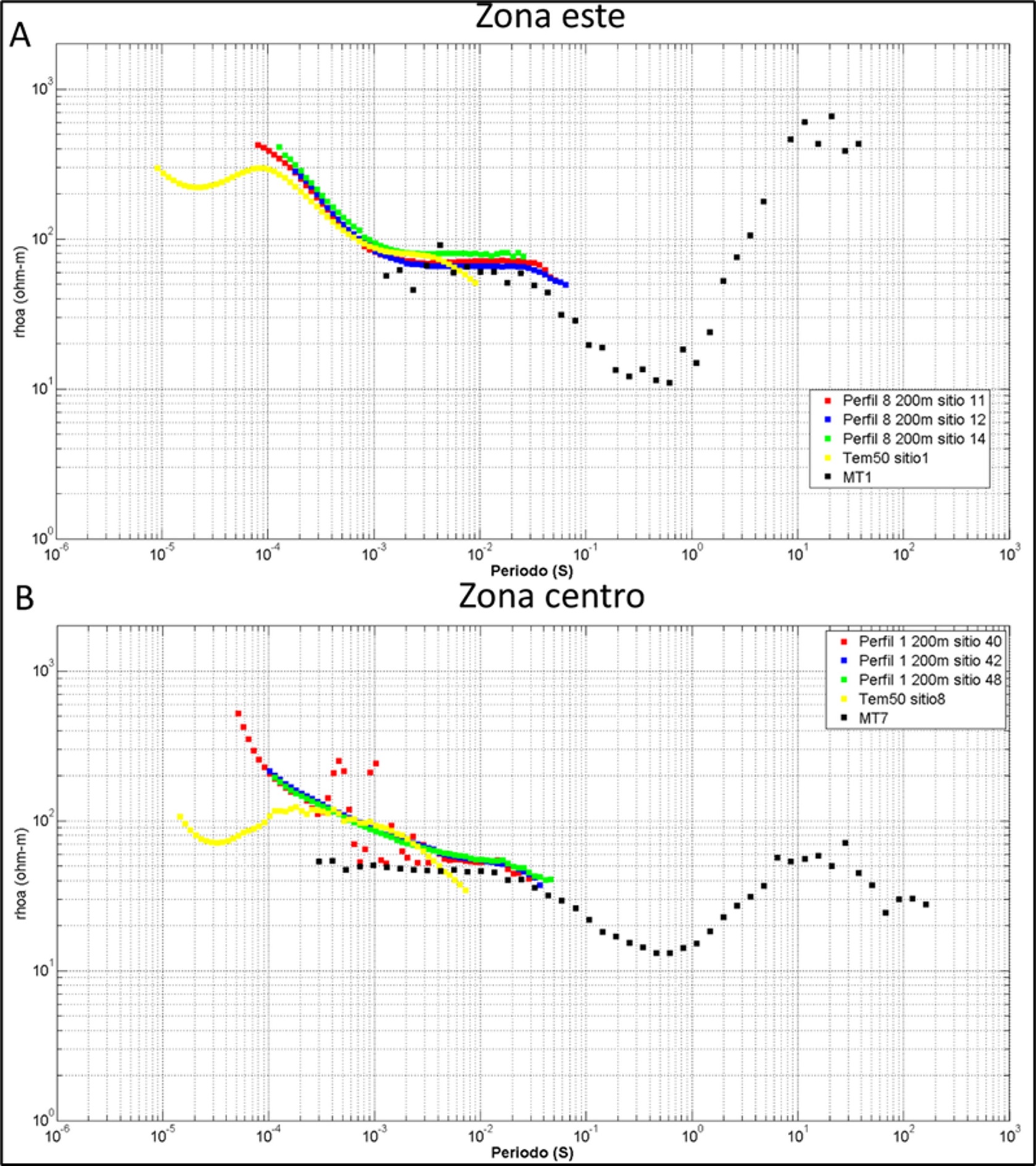 En la figura 8 se muestra la comparación de los resultados electromagnéticos en los perfiles característicos de la zona este (Fig. 8A: perfil TEM200-8, estación TEM50-1, estación MT1, ver ubicación en Fig. 6) y de la zona centro (Fig. 8B: perfil TEM200-1, estación TEM50-8, estación MT7, ver ubicación en Fig. 6), graficados según el período. En el caso de las curvas TEM, estas son el dato crudo previo a la modelación, después de promediar los distintos pulsos y seleccionar la porción de la curva no afectada por ruido. Luego se lleva al dominio de las frecuencias según la fórmula de Sternberg et al., (1988). Para no sobrecargar la figura, se muestran solo 3 mediciones TEM 200 del perfil, sin embargo, no hay mayores diferencias con las restantes. En el caso del MT, la curva corresponde al dato procesado con los criterios descritos previamente.