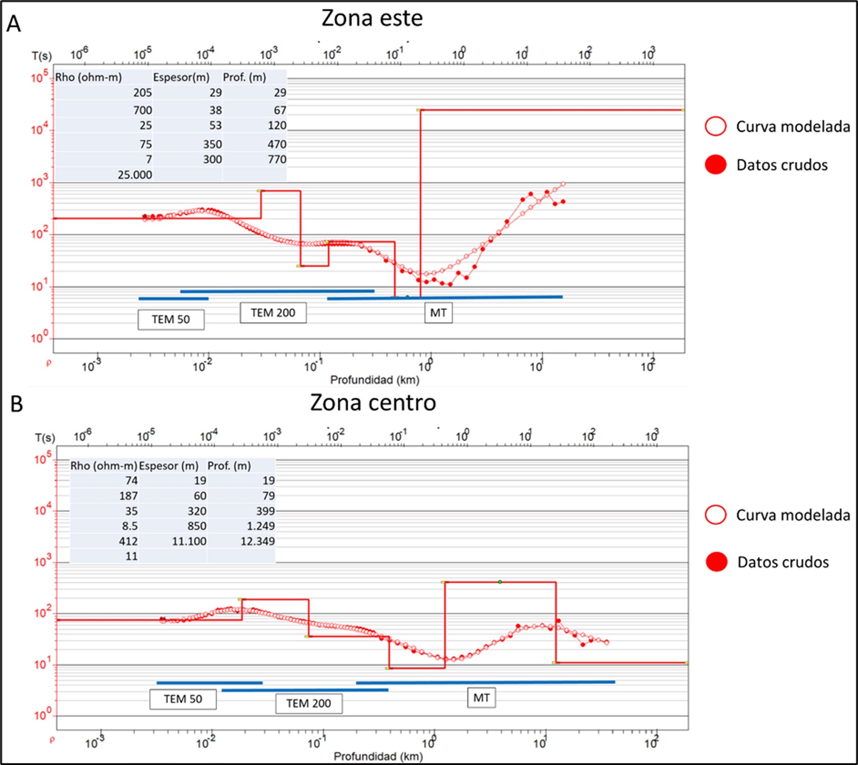 Una primera característica destacable de este set de datos compuestos es su amplio rango de observación, entre 10-5 y 10+2 segundos, lo cual tiene directa implicancia en el rango de profundidades mapeadas (al menos 4 órdenes de magnitud). También se aprecia tanto el buen ajuste de los distintos métodos como entre la curva modelada (círculos blancos) y la de los datos (círculos rojos). En la figura 9A, se puede ver el resultado en el perfil característico de la zona este, cuyo ajuste entre la curva modelada y la inicial es bastante bueno, y solo presenta diferencias mayores hacia el final de la curva. Esto puede afectar en parte la definición del espesor del conductor de 5 ohm-m que aparece desde los 500 m, pero su techo queda bien definido por el ajuste en periodos menores. Alrededor de los 850 m aparece un dominio marcadamente resistivo que podría asociarse a una roca de baja a nula porosidad, o bien a una roca cristalina de basamento impermeable.