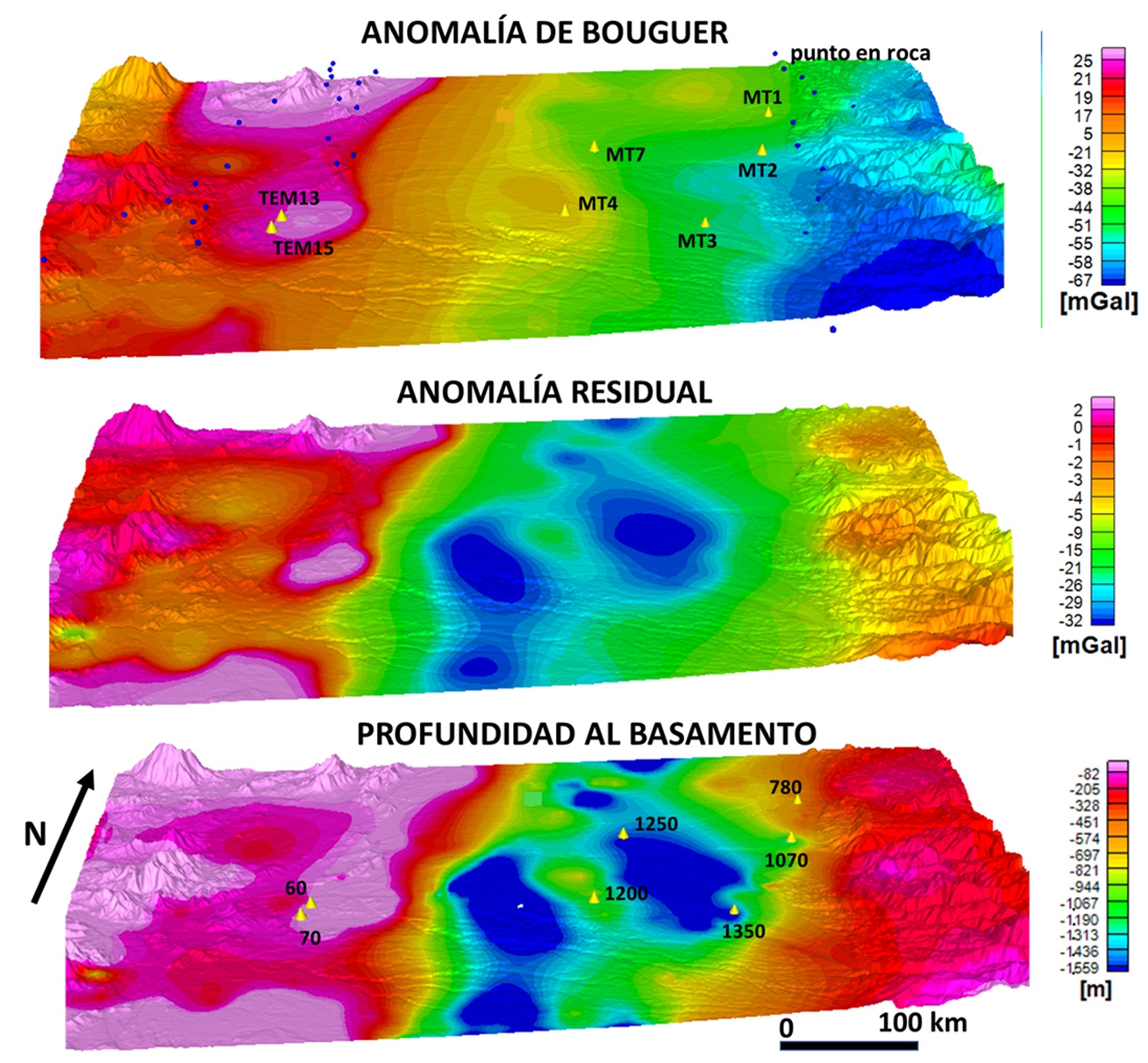 La anomalía de Bouguer para el área de estudio se presenta en la figura 10 (panel superior). Ella tiene el patrón característico para ambientes andinos, con un descenso de la gravedad en dirección este (a razón de 1-2 mGal/km), producto del defecto de masa asociado a la raíz de la cordillera de los Andes (e.g., Tassara y Yáñez, 2003). Para eliminar esta tendencia de campo regional se emplean los puntos de control de basamento derivados del estudio electromagnético integrado (Fig. 10, panel superior). Se incluyen como puntos de control aquellos lugares de medición en los cuales el basamento está aflorando, principalmente en los flancos oriental y occidental del área de estudio (Fig. 10, panel superior). Al estimar el campo regional a partir de los puntos de control se obtiene la anomalía de gravedad residual para el área de estudio (Fig. 10, panel intermedio), que corresponde a la resta de la anomalía de Bouguer y el campo regional (corregido manualmente). Por último, la profundidad hasta el basamento se determina mediante la modelación 3D de la anomalía residual de gravedad. Este proceso se efectúa utilizando el algoritmo desarrollado por Yáñez et al. (2015), que considera una densidad de basamento de 2,65 gr/cc y una densidad del relleno promedio de 2,1 gr/cc (contraste en densidad de -0,55 gr/cc). El resultado de esta modelación se presenta en la figura 10, panel inferior.