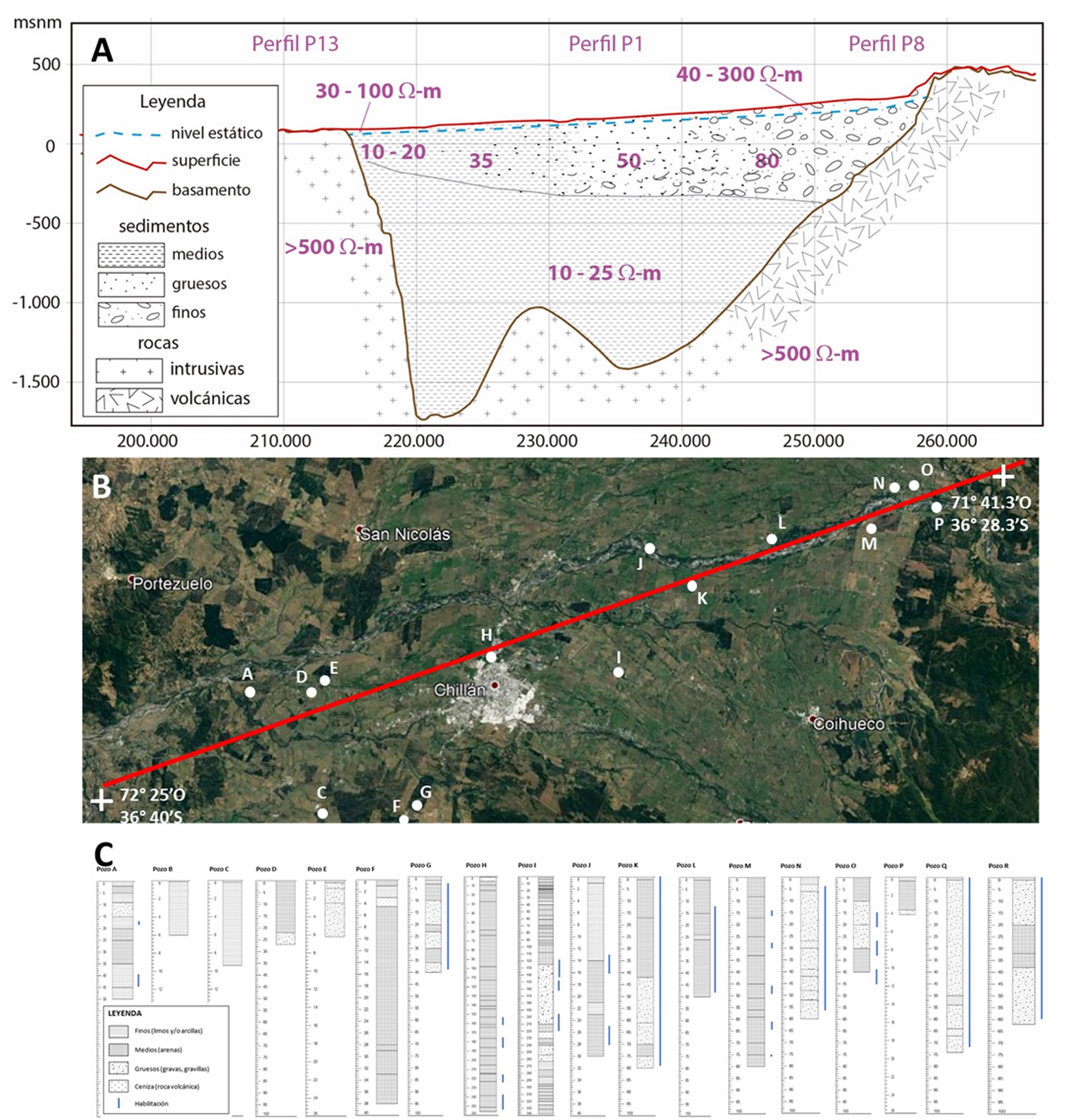 FIG. 11. A. Perfil hidrogeológico conceptual SO-NE, paralelo al río Ñuble a partir de la información TEM, MT y gravimétrica (Figs. 6 y 9); escala horizontal indica coordenada UTM este. B. Ubicación del perfil. C. Estratigrafías y habilitación de pozos a lo largo del perfil; se identifican los tramos de acceso del agua subterránea con líneas verticales color azul.