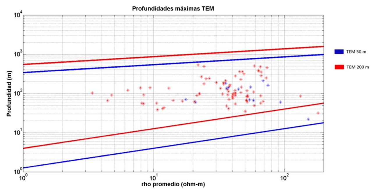 Las profundidades de observación con la técnica TEM dependen en primer lugar del tamaño de la antena transmisora (cuadrado en el cual se hace circular la corriente transiente en el método TEM, el tamaño corresponde al lado del cuadro) y la resistividad del medio. Para el caso aquí estudiado, en general, la profundidad de observación resultante fue entre una y dos veces el tamaño de la antena transmisora, para un tamaño de 200 y 50 m, por consiguiente esta metodología permitiría, en teoría, mapear hasta 400 m de profundidad con una resolución de 10-50 m, dependiendo de la resistividad del medio. El objetivo de las estaciones TEM con tamaño de antena transmisora de 50 m es aportar información en capas superficiales, donde los datos TEM para la antena de mayor tamaño carecen de resolución. Además, desde un punto de vista metodológico, la realización de estaciones TEM de tamaño pequeño busca comparar su resolución a profundidad con el resultado equivalente en antenas de mayor tamaño. De tal forma, es necesario evaluar la factibilidad de solo usar antenas transmisoras pequeñas, de menor tiempo de operación y dificultad logística, y mejor razón señal/ruido.