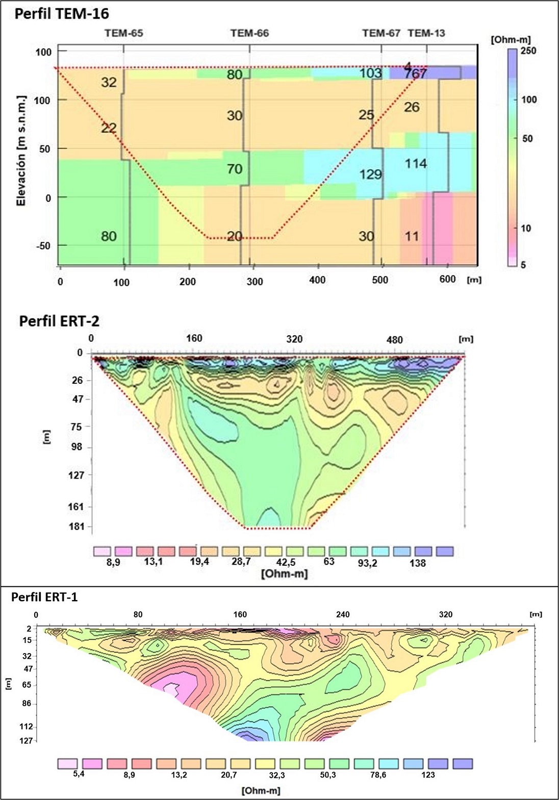 La zona no saturada y/o parte superior del acuífero se puede caracterizar mediante las capas geoeléctricas más superficiales reconocidas en todas las líneas estudiadas (40-300 ohm-m, Fig. 11), con espesores variables de oriente a poniente, que pueden alcanzar hasta 50-100 m de profundidad en las zonas este y centro y que hacia la zona oeste disminuye su espesor a valores del orden de 20 m. Esta unidad se asocia a secuencias sedimentarias conformadas por gravas, arenas, y cantidades variables de arcilla y limo con contenidos de humedad variables, posiblemente no saturados.