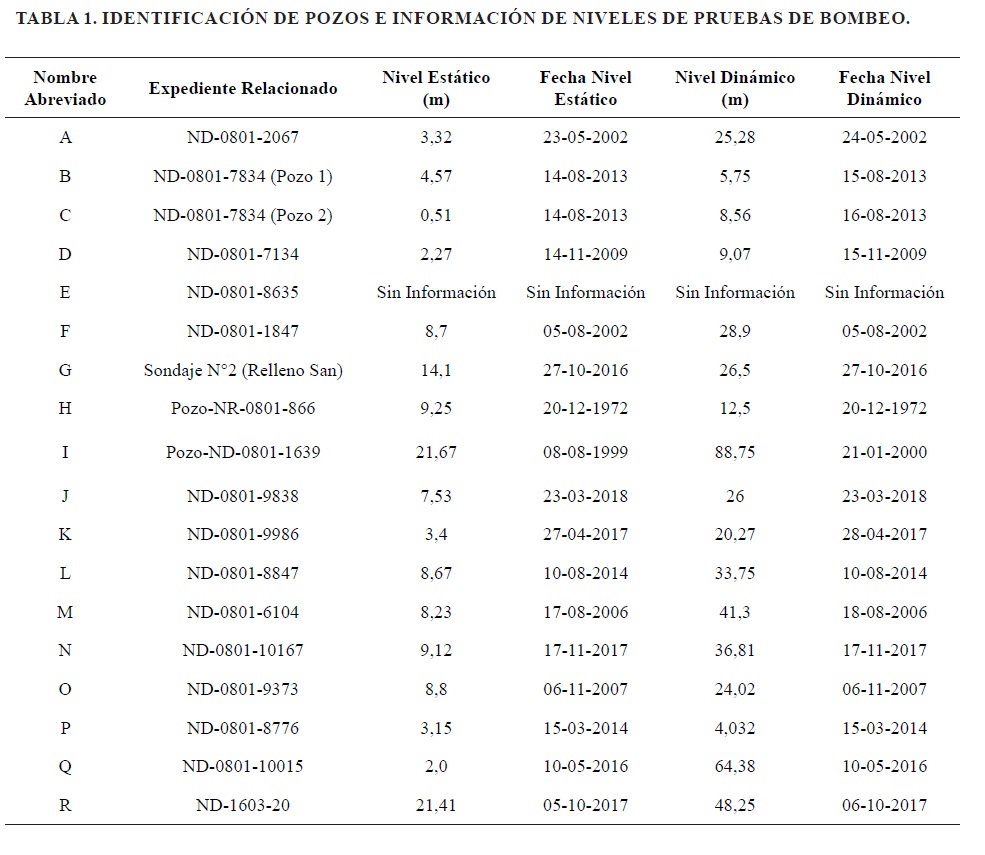 La Tabla 1 muestra los datos de expedientes de pozos obtenidos de la DGA utilizados para las estratigrafías y habilitaciones de pozos mostradas en la figura 11. Se aprecia que para una importante cantidad de estos pozos existe una gran diferencia entre los niveles estáticos y dinámicos registrados durante las pruebas de bombeo de estos. El Nombre Abreviado indicado en la primera columna de esta tabla corresponde al mostrado en el mapa de ubicación de estos pozos presentado en la figura 11.