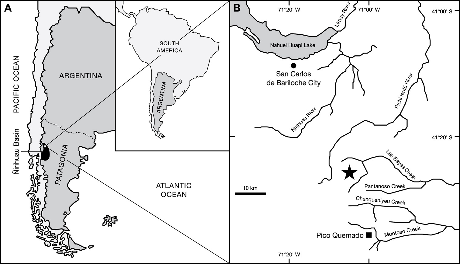 The fossil material comes from Quebrada Vera site (ca. 41°26ʼ S-71°08ʼ W) located at the Cordón Las Bayas hills, about 30 km south of the San Carlos de Bariloche City, W Río Negro Province, Argentina (Fig. 1).