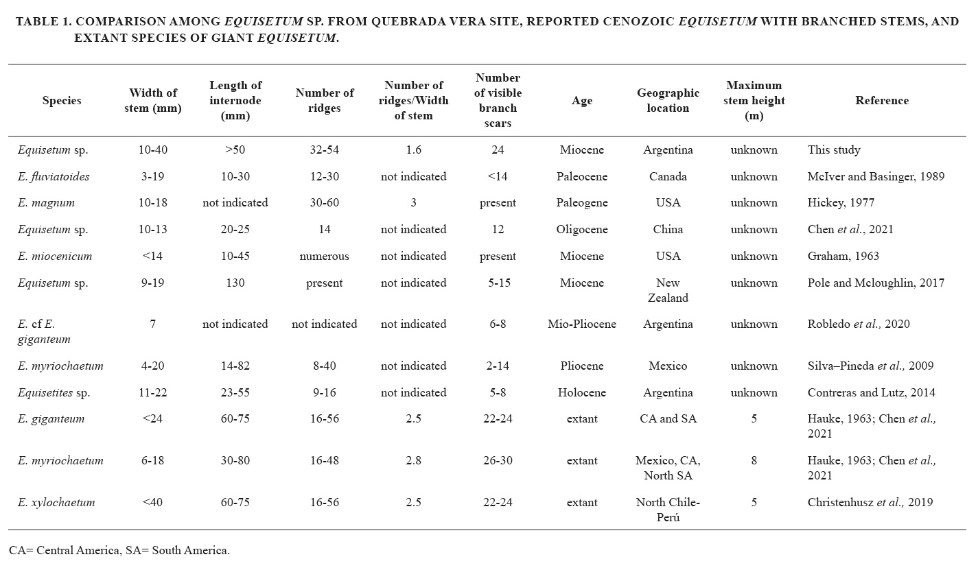 In South America, Anzótegui and Horn (2011) recorded and illustrated one specimen of Equisetum sp. that consists of a jointed stem of 1.4 cm wide with toothed leaves from the Late Miocene of North Argentina. From the Holocene of the same region, Contreras and Lutz (2014) described Equisetites sp. represented by ribbed stem impressions of 11-22 mm in width with radial whorls of branches at the nodes that they found similar to E. giganteum. Robledo et al. (2020) reported Equisetum cf. E. giganteum from the Miocene-Pliocene also from Northern Argentina. This material consists of nodal diaphragms of up to 4.9 mm in diameter, branches and stem fragments of about 7 mm in average diameter, with 6 to 8 branch traces close to the nodes, and with about 20 triangular leaves (Table 1). The three known Cenozoic South American records come from northern Argentine deposits, and consist of stems and nodal diaphragms that are remarkably smaller than those of the Ñirihuau Formation.