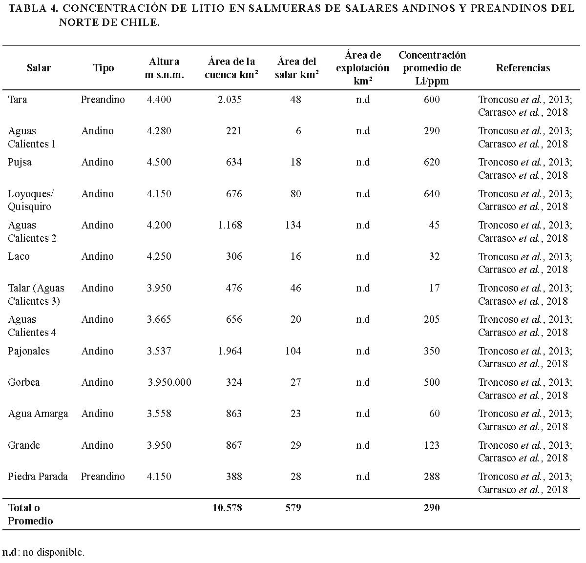 Un grupo de 9 salares corresponde a aquellos que incluyen cálculos individuales de tonelaje con concentraciones medias de litio notificadas (Tabla 3, incluye parte del salar de Atacama). Este grupo cubre una superficie de 2.003 km2, con una cantidad estimada de 3.335.100 toneladas de litio con una concentración media en las salmueras de 561 ppm. Las cifras de tonelaje de litio (Tabla 3) no cumplen con el código NI 43-101, pero podrían utilizarse como una indicación preliminar del potencial económico, así como una referencia para futuras actividades de exploración y evaluación.