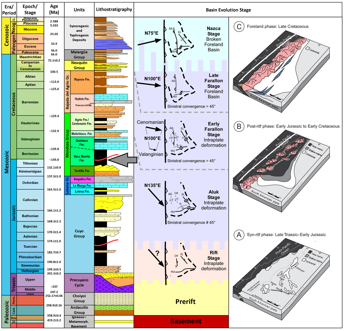 FIG. 3. General stratigraphic chart showing main stages of Neuquén Basin evolution (A-C) and the studied interval (gray arrow). Modified from Howell et al. (2005) and Marchal et al. (2020).
