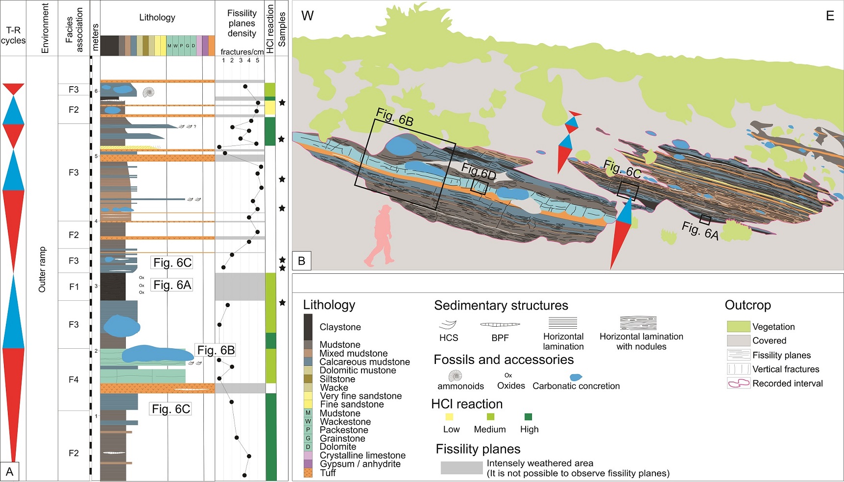 FIG 7. Fissility study at Arroyo Mulichinco outcrop, Cerro Mulichinco area. A. Detailed stratigraphic profile showing the sequential interpretation (T-R cycles represented by the blue and red triangles, respectively), facies association, lithology, fissility planes density (count of fissility planes with 5 cm windows), HCl reaction and sample location. B. Line drawing of the outcrop and lithologic and sedimentary interpretation. Labels “Fig. 6A-D” indicate the location of the photos presented in figure 6. HCS: Hummoky Cross Stratification. BPF: Bed-Parallel Fracture.